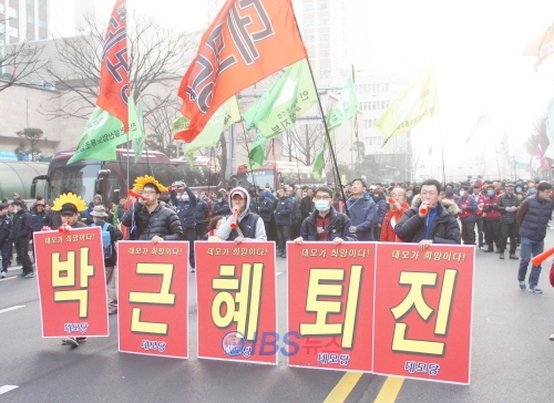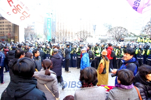 25ÀÏ ¼¿ï±¤Àå¿¡¼ ¿¸° 2.25 ±¹¹ÎÆÄ¾÷ Áýȸ ÀÌ ÈÄ ÁøÇàÇÑ °Å¸®ÇàÁø¿¡¼ °æÂûÀÌ ÁýȸÂü°¡ÀÚµéÀÇ ÇàÁøÀ» ¸·°í ÀÖ´Ù.