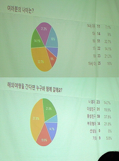 ¡ã(À§ÂÊ) ºÎõ½Ã¿¡ »ç´Â ´Ù¾çÇÑ ¿¬·ÉÃþÀÇ Ã»¼Ò³âÀÌ Åä·Ðȸ¿¡ Âü¿©Çß´Ù. (¾Æ·¡ÂÊ) ¼³¹® Áß Æ¯º°È÷ 'ÇÔ²² ¿©ÇàÇÏ°í ½ÍÀº ´ë»ó'À» ¹¯´Â Áú¹®¿¡ µ¿¼ºÄ£±¸°¡ °¡Àå ¸¹Àº ºñÁßÀ» Â÷Áö, ÇÑÆí ¼±»ý´ÔÀº 0%·Î ÀûÀº ºñÁßÀ» Â÷ÁöÇß´Ù.