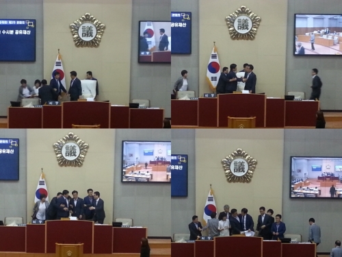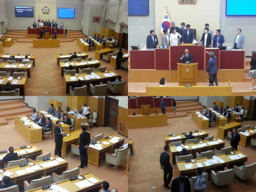 ºÎõ½ÃÀÇȸ º»È¸Àǰ¡ ÁøÇàµÇ´Â °¡¿îµ¥ »õ´©¸®´çÃø ÀÇ¿øµéÀÌ º»È¸ÀÇÀåÀ» °É¾î Àá±Ùä Á¡°ÅÇϰí ÀÖ¾î ȸÀǰ¡ ¼Ó°³µÇÁö ¸øÇÏ°í ÆÄÇàÀ» °ÅµìÇϰí ÀÖ´Ù.