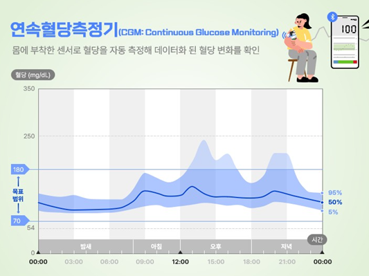 À̸¦ À§ÇØ ÃÖ±Ù¿¡´Â ¿¬¼ÓÇ÷´çÃøÁ¤±â(CGM: Continuous Glucose Monitoring)¸¦ Ȱ¿ëÇØ 24½Ã°£ µ¿¾È Ç÷´çÀÇ º¯È­¸¦ ½Ç½Ã°£À¸·Î È®ÀÎÇÒ ¼ö ÀÖ´Ù. ¿¬¼ÓÇ÷´çÃøÁ¤±â¶õ ÆÈ¿¡ ¼¾¼­¸¦ ºÎÂøÇØ ÀÏÁ¤ °£°ÝÀ¸·Î Ç÷´çÀ» ÀÚµ¿ÃøÁ¤Çϰí, ½º¸¶Æ®Æù ¾ÛÀ¸·Î µ¥ÀÌÅ͸¦ Àü¼ÛÇÏ´Â ÀåÄ¡´Ù. äÇ÷ ¾øÀÌ Ç÷´ç ¼öÄ¡¸¦ Áö¼ÓÀûÀ¸·Î ¸ð´ÏÅ͸µÇÏ´Â ¹æ¹ýÀ¸·Î, ½Ä»ç, ¿îµ¿, ¼ö¸é µî ÀÏ»ó Ȱµ¿¿¡ µû¸¥ ÀÚ½ÅÀÇ Ç÷´ç ¹ÝÀÀÀ» ½Ç½Ã°£À¸·Î üũÇÒ ¼ö ÀÖ´Ù.