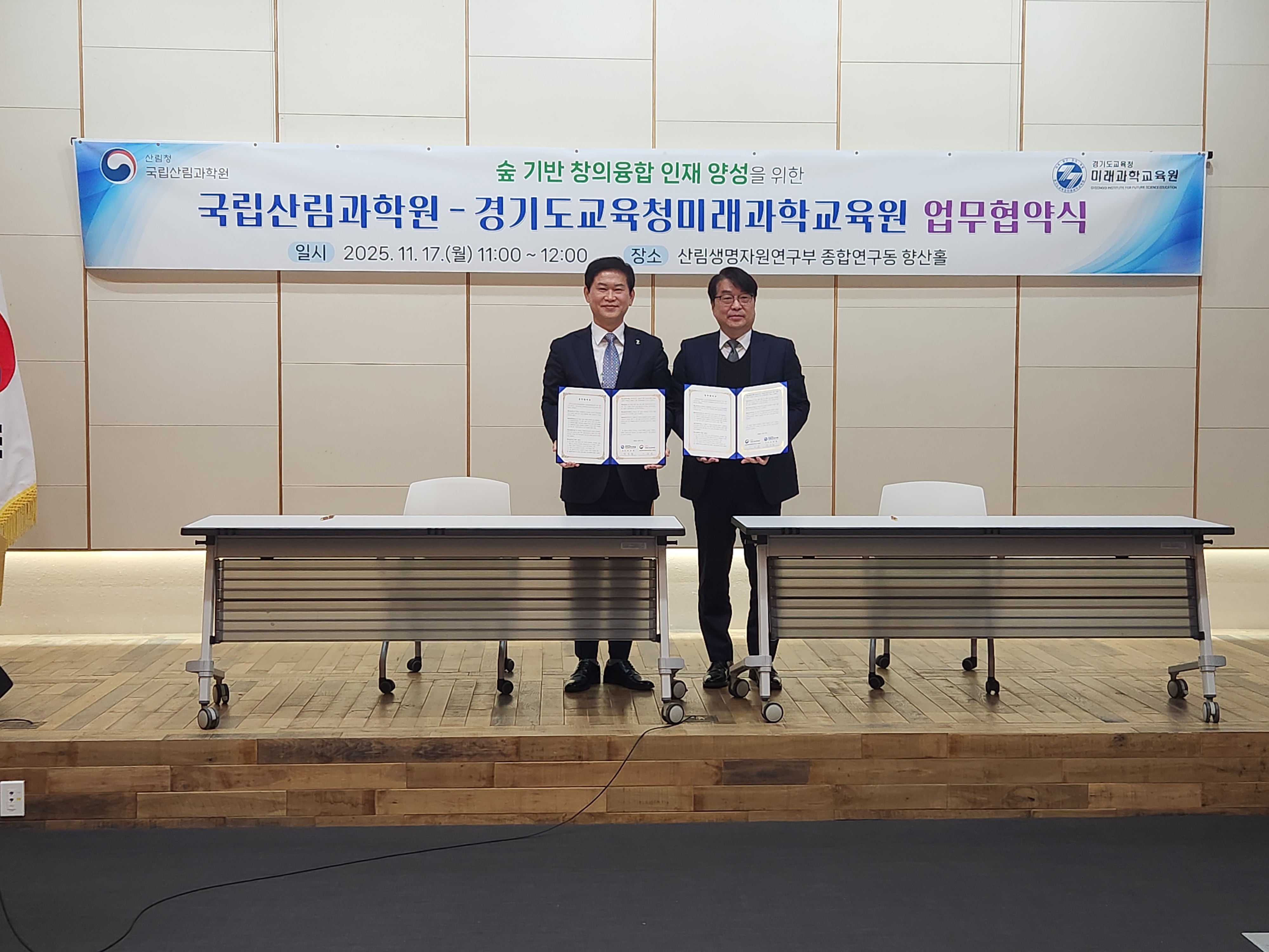°æ±âµµ±³À°Ã»¹Ì·¡°úÇб³À°¿ø(¿øÀå ¹ÚÁ¤Çà)ÀÌ 17ÀÏ »ê¸²Ã» ±¹¸³»ê¸²°úÇпø(¿øÀå ±è¿ë°ü)°ú ½£ ±â¹Ý âÀÇÀ¶ÇÕÇü ÀÎÀç ¾ç¼ºÀ» À§ÇÑ Çù·Âü°è ±¸ÃàÀ» À§ÇØ ¾÷¹«Çù¾à(MOU)À» ü°áÇß´Ù.