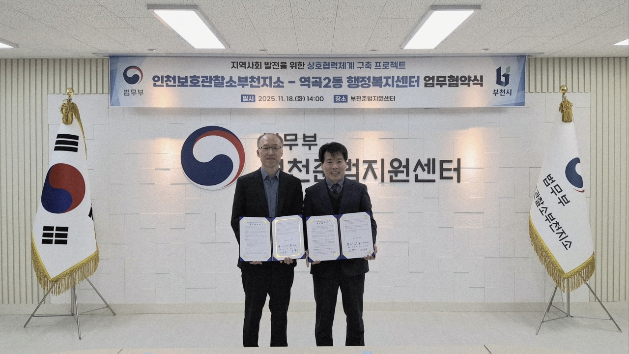 ¹ý¹«ºÎ(Àå°ü Á¤¼ºÈ£) ºÎõÁعýÁö¿ø¼¾ÅÍ(ºÎõº¸È£°üÂû¼Ò)´Â 2025. 11. 18.(È­) û»ç 5Ãþ ´ëȸÀǽǿ¡¼­ ¿ª°î2µ¿ ÇàÁ¤º¹Áö¼¾ÅÍ(µ¿Àå ¹®Çö½Ä)¿Í ¾÷¹«Çù¾à½ÄÀ» °³ÃÖ, Áö¿ª»çȸ ¹ßÀü µµ¸ð¿Í º¸È£°üÂû ´ë»óÀÚÀÇ °ÇÀüÇÑ »çȸº¹±Í ¹× Àç¹ü ¹æÁö¸¦ À§ÇÑ »óÈ£ Çù·Âü°è¸¦ ±¸ÃàÇϱâ·Î ¶æÀ» ¸ð¾Ò´Ù.