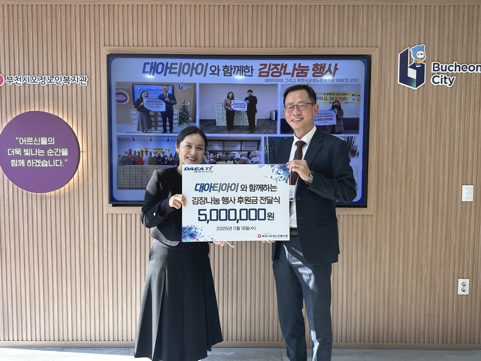 ºÎõ½Ã¿ÀÁ¤³ëÀκ¹Áö°ü(°üÀå Ȳ¼º¾Ö)Àº 11¿ù 19ÀÏ ´ë¾ÆÆ¼¾ÆÀÌ(ÁÖ)¿Í ÇÔ²² Ãë¾à°èÃþ ¾î¸£½ÅµéÀÇ ¾ÈÁ¤ÀûÀÎ °Ü¿ïö ½Ä»ýȰ Áö¿øÀ» À§ÇÑ ±èÀ峪´®Çà»ç ÈÄ¿ø±Ý Àü´Þ½ÄÀ» ÁøÇàÇß´Ù.