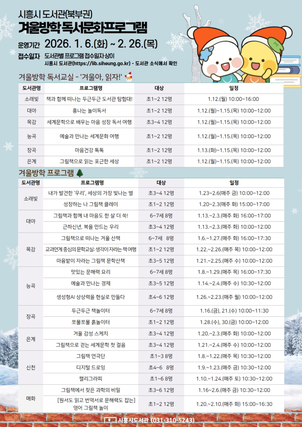 ½ÃÈï½Ã(½ÃÀå ÀÓº´ÅÃ)´Â °Ü¿ï¹æÇÐÀ» ¸Â¾Æ ºÏºÎ±Ç 8°³ °ø°øµµ¼°ü(¼Ò·¡ºû¤ý´ë¾ß¤ý¸ñ°¨¤ý´É°î¤ýÀå°î¤ýÀº°è¤ý½Åõ¤ý¸ÅÈ)¿¡¼ 1¿ù 6ÀϺÎÅÍ 2¿ù 26ÀϱîÁö °Ü¿ïµ¶¼±³½Ç ¹× °Ü¿ï¹æÇÐ ÇÁ·Î±×·¥À» ¿î¿µÇÑ´Ù.