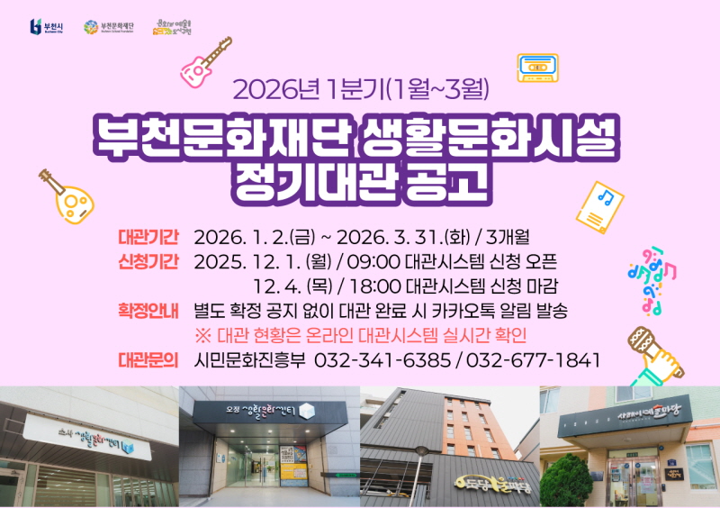 ºÎõ¹®ÈÀç´Ü(´ëÇ¥ ÇѺ´È¯)Àº Áö¿ª »ýȰ¹®Èµ¿È£È¸ ¹× °³ÀÎÀÇ ¹®È¿¹¼ú Ȱµ¿ Áö¿øÀ» À§ÇØ 2026³â 1ºÐ±â(1¿ù~3¿ù) »ýȰ¹®È½Ã¼³ Á¤±â´ë°ü ½ÅûÀ» ¹Þ´Â´Ù.