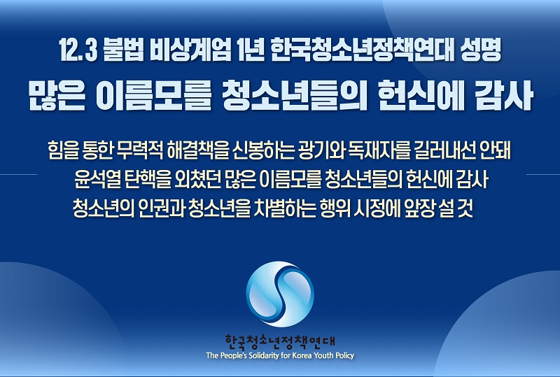 À̳¯ Á¤Ã¥¿¬´ë ¼º¸í¿¡ µû¸£¸é ¡°1³âÀü 12¿ù 3ÀÏ ¹ã ºÒ¹ý ºñ»ó°è¾öÀ» ¼±Æ÷µÇÀÚ ±¹¹ÎµéÀº ±¹È¸·Î ´Þ·Á°¡ ¹ÎÁÖÁÖÀǸ¦ ÁöÄ×°í ¹ÎÁÖÁÖÀÇ À¯¸°À» ¸·¾Ò´Ù. ÀÌÈÄ ¸¹Àº û¼Ò³âµéÀº À±¼®¿ ³»¶õ ¿ìµÎ¸Ó¸®¸¦ źÇÙÇØ¾ß ÇÑ´Ù¸ç °Å¸®·Î ³ª¼¹°í Çѱ¹Ã»¼Ò³âÁ¤Ã¥¿¬´ë¸¦ ºñ·ÔÇÑ ´Ù¼öÀÇ Ã»¼Ò³â´Üü ÁöµµÀڵ鵵 ½Ã±¹¼±¾ðÀ» ¹ßÇ¥ÇÏ°í ³»¶õ ¼¼·ÂµéÀÇ Ã³¹úÀ» ¿ä±¸Çß¾ú´Ù."