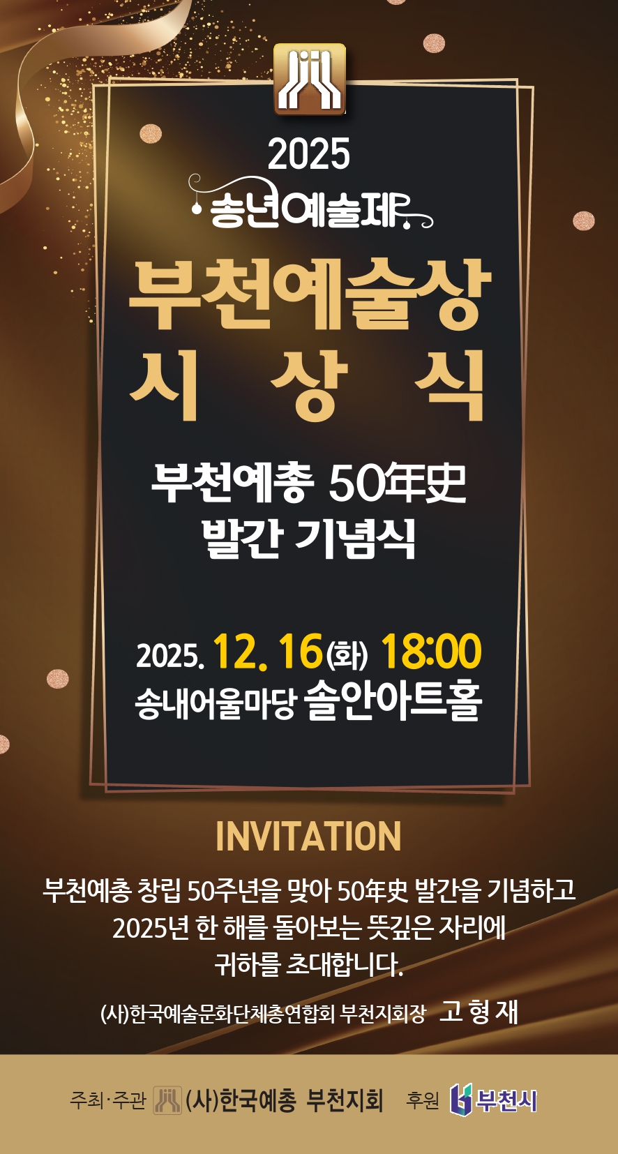 Çѱ¹¿¹ÃѺÎõÁöȸ(ȸÀå °íÇüÀç)´Â ¿À´Â 12¿ù 16ÀÏ(È­) ºÎõ ¼Û³»¾î¿ï¸¶´ç ¼Ö¾È¾ÆÆ®È¦¿¡¼­ À̹é¿À½Ê¿© ¸íÀÇ ¿¹ÃÑ °¡Á·°ú µ¿¾Æ¸®´Üü°¡ ÇÔ²² ÇÏ´Â ¡°2025 ¼Û³â¿¹¼úÁ¦, ºÎõ¿¹¼ú»ó ½Ã»ó½Ä & ºÎõ¿¹ÃÑ 50³â»ç ¹ß°£ ±â³ä½Ä¡±À» °³ÃÖÇÑ´Ù.