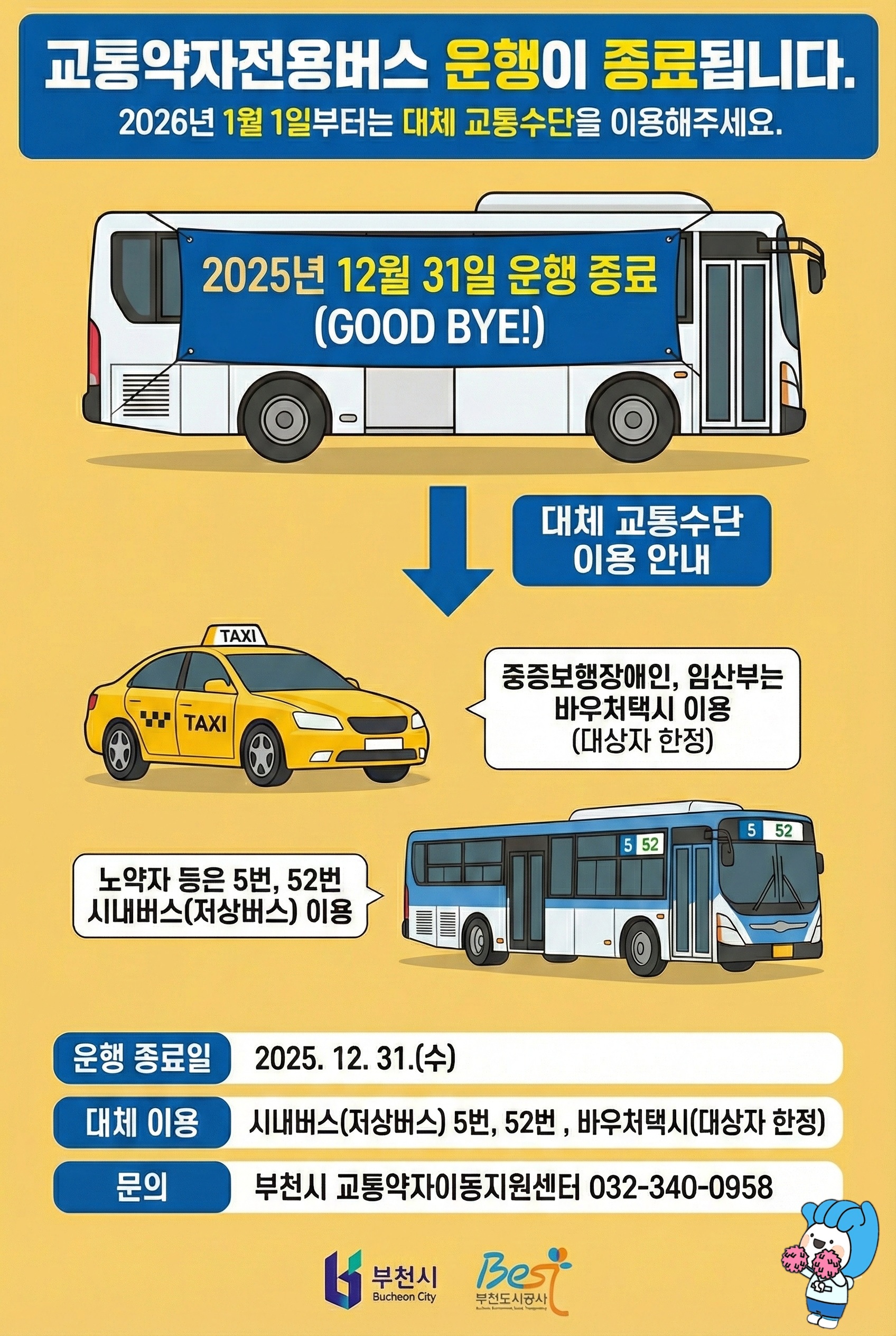¡®±³Åë¾àÀÚÀü¿ë¹ö½º¡¯ ¿îÇà Á¾·á¿Í °ü·ÃÇÑ ´ëü ±³Åë¼ö´Ü ¹®ÀÇ´Â ºÎõ½Ã ±³Åë¾àÀÚÀ̵¿Áö¿ø¼¾ÅÍ(032-340-0958)·Î ÇÏ¸é µÈ´Ù.