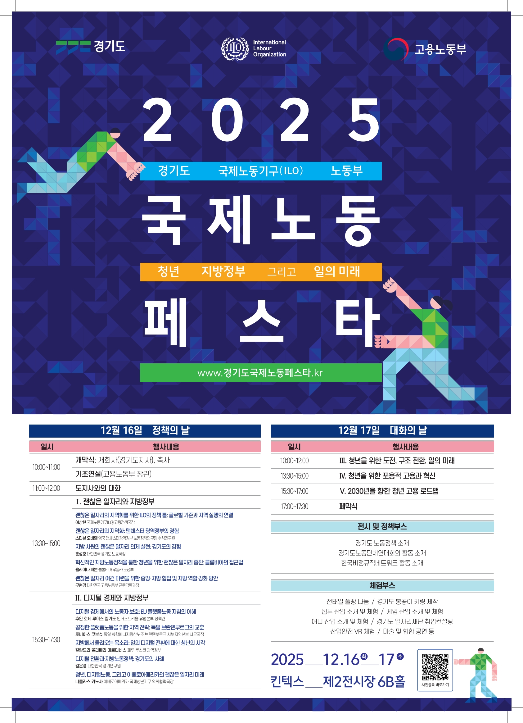 °æ±âµµ°¡ ±¹Á¦³ëµ¿±â±¸(ILO), °í¿ë³ëµ¿ºÎ¿Í ÇÔ²² 12¿ù 16Àϰú 17ÀÏ ÀÌÆ²°£ ¡®Ã»³â, Áö¹æÁ¤ºÎ ±×¸®°í ÀÏÀÇ ¹Ì·¡¡¯¸¦ ÁÖÁ¦·Î ¡®2025 ±¹Á¦³ëµ¿Æä½ºÅ¸¡¯¸¦ °í¾ç ŲŨ½º Á¦2Àü½Ã°ü¿¡¼ °³ÃÖÇÑ´Ù.