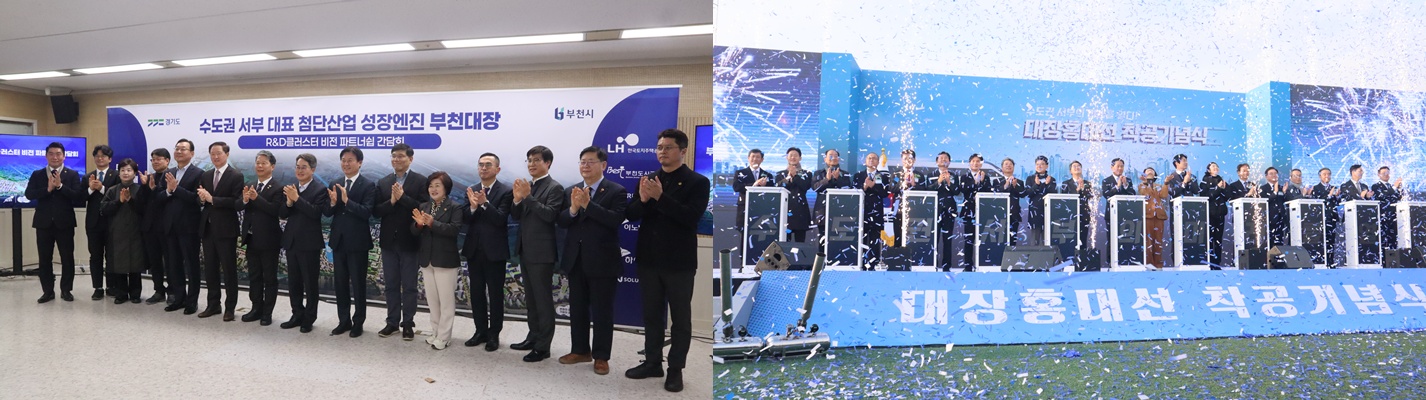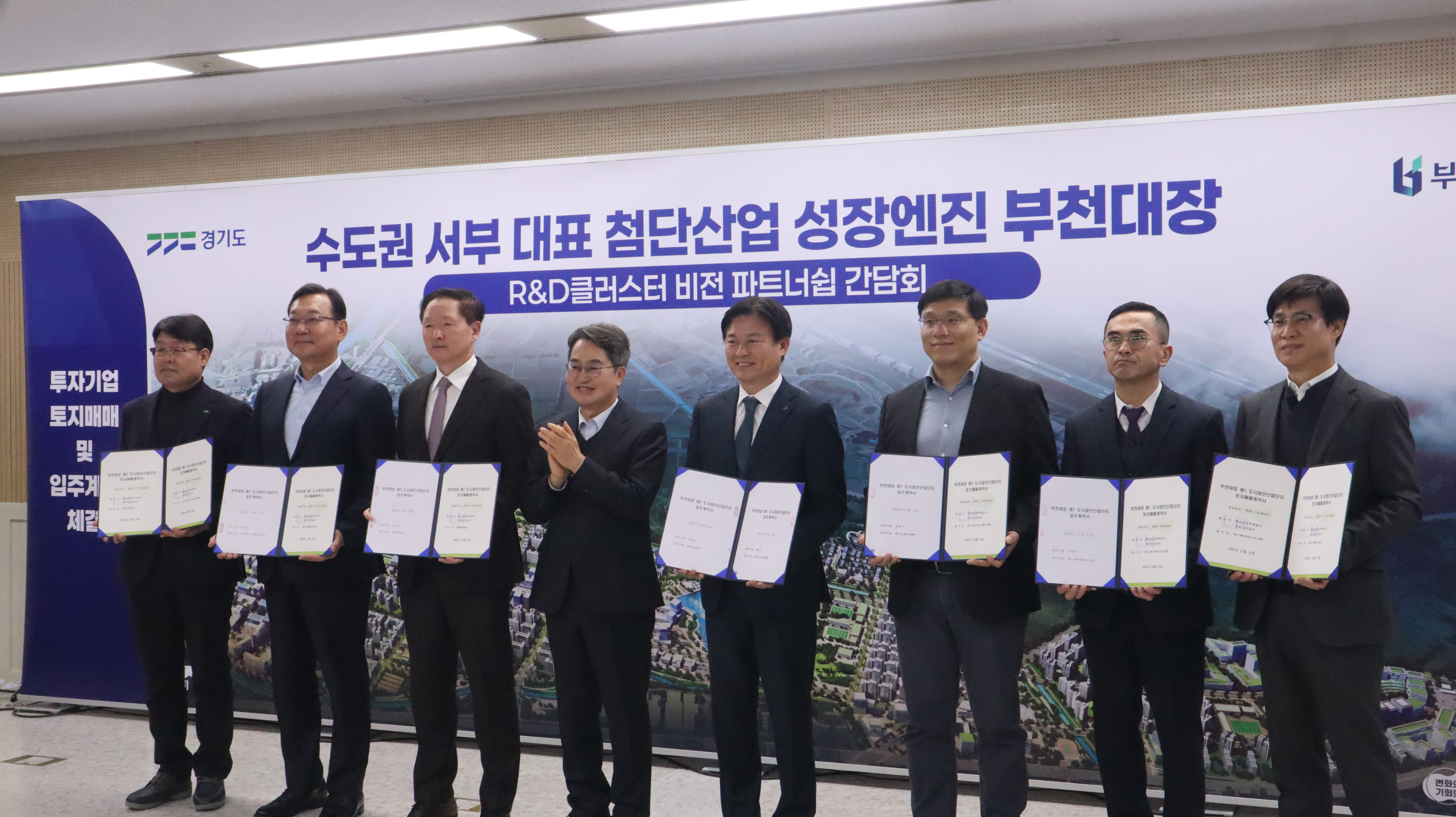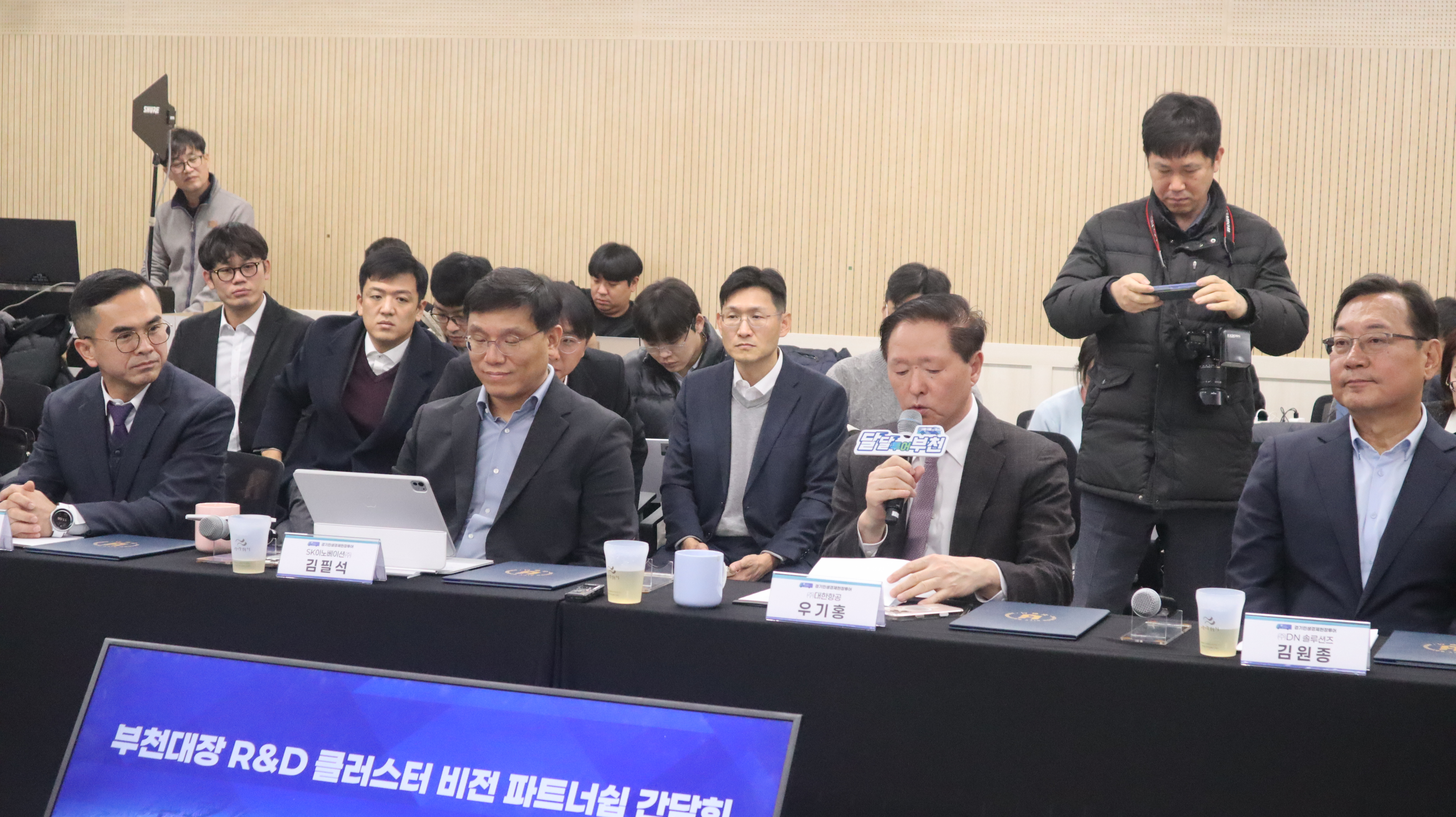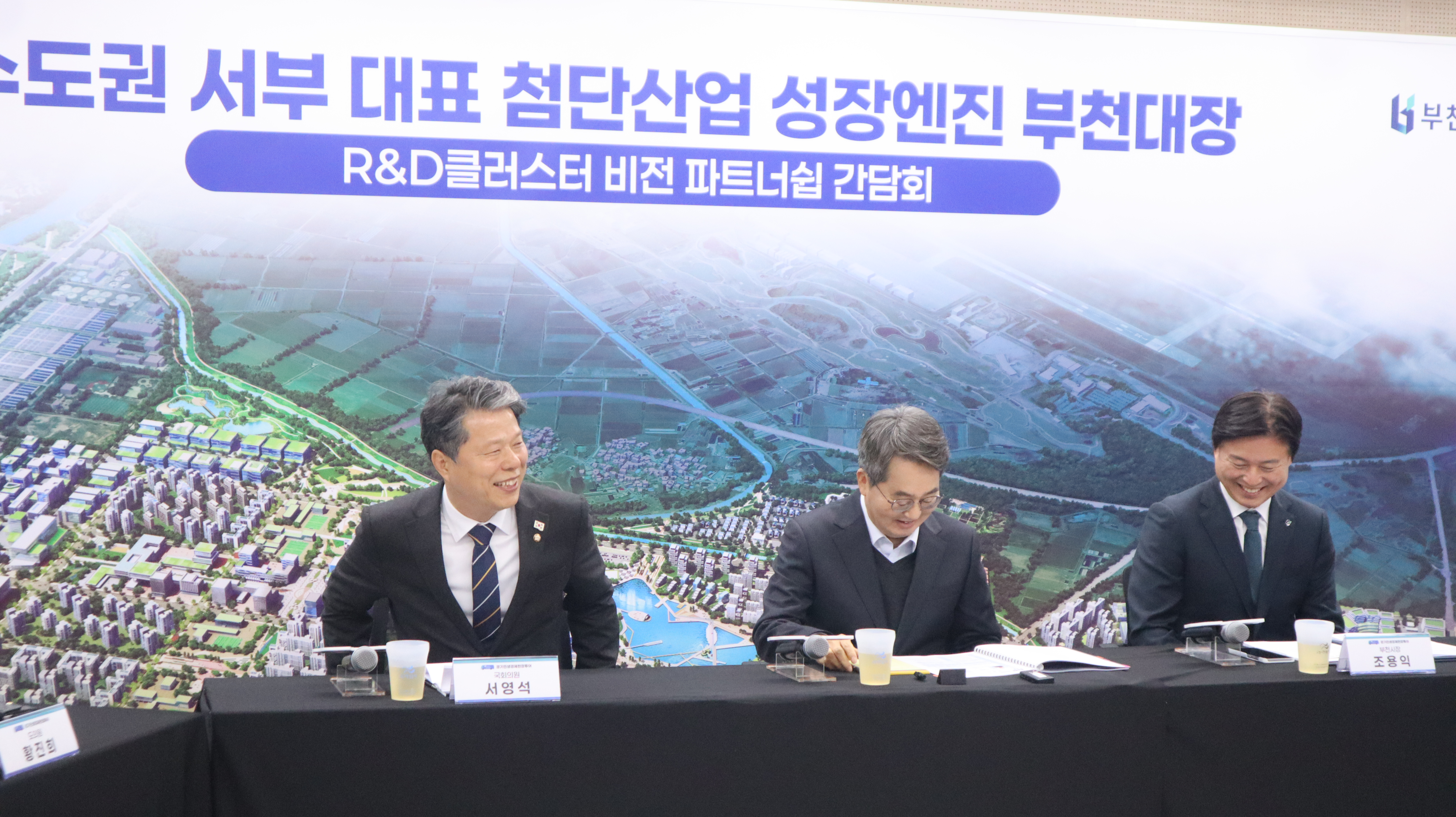 ¸ÕÀú 15ÀÏ ¿ÀÀü ¿ÀÁ¤±¸Ã» ´ë°´ç½Ç¿¡¼ ¿¸° ºÎõ´ëÀå µµ½Ã÷´Ü»ê¾÷´ÜÁö ÀÔÁÖ°è¾à ü°á½Ä ¹× ¡®ºÎõ´ëÀå R&D Ŭ·¯½ºÅÍ ºñÀü ÆÄÆ®³Ê½± °£´ãȸ¡¯¿¡¼´Â ±èµ¿¿¬ °æ±âµµÁö»ç, Á¶¿ëÀÍ ºÎõ½ÃÀå, ¼¿µ¼® ±¹È¸ÀÇ¿ø, ¿ì±âÈ« ´ëÇÑÇ×°ø ºÎȸÀå, ±èÇʼ® SKÀ̳뺣ÀÌ¼Ç È¯°æ±â¼ú¿øÀå, ¹ÚÈ£Çö SKÇÏÀ̴нº ºÎ»çÀå, ±è¿øÁ¾ DN¼Ö·ç¼ÇÁî ´ëÇ¥ µî 4°³ ±â¾÷°ú °æ±âµµÀÇȸ À̼±±¸, ÀÌÀ翵, ȲÁøÈñ, ±èµ¿Èñ, À¯°æÇö, ¹Ú»óÇö ÀÇ¿ø µîÀÌ Âü¼®Çß´Ù.