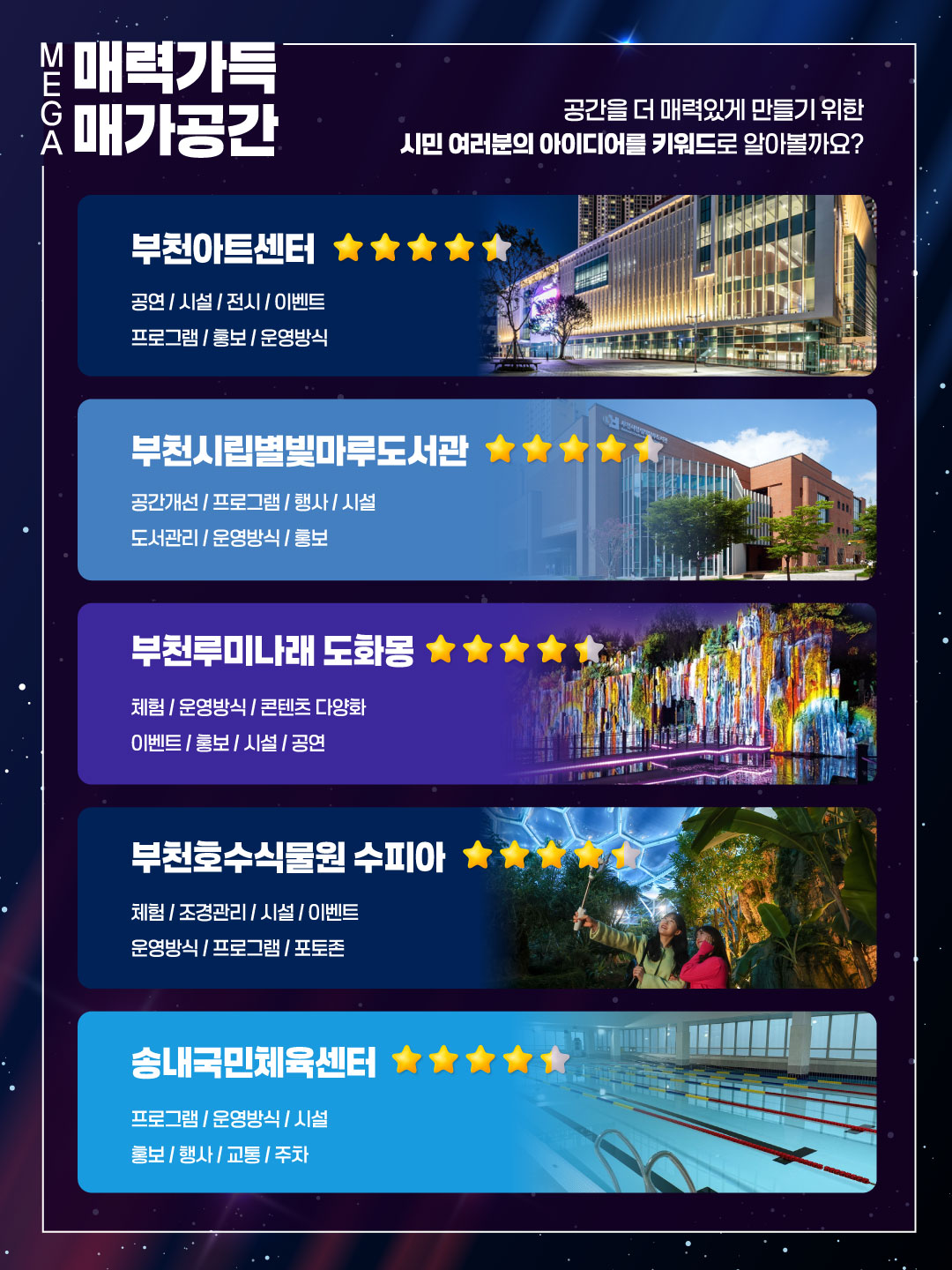 ¡®¸Å°¡(MEGA) °ø°£¡¯Àº ºÎõ½Ã Á¤Ã¥Á¦¾È ¿Â¶óÀÎ Ç÷§Æû ¡®ºÎõ, Á¦¾ÈÇÚ½ç!¡¯À» ÅëÇØ °ø¸ðÇÑ ½Ã¹Î Á¦¾È ÀÇÁ¦·Î, ¡®ºÎõÀ» ´õ Å©°Ô! ´õ ¸Å·Â ÀÖ°Ô!¡¯¶ó´Â ½½·Î°Ç ¾Æ·¡ ½Ã¹ÎÀÌ Á÷Á¢ °ø°ø °ø°£ÀÇ ¸Å·ÂÀ» Æò°¡ÇÏ´Â Âü¿©Çü ÇÁ·ÎÁ§Æ®´Ù.