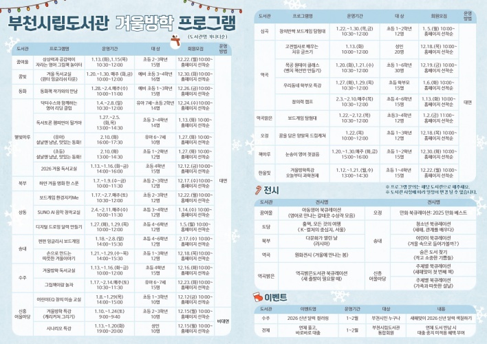 ºÎõ½Ã´Â °Ü¿ï¹æÇÐÀ» ¸Â¾Æ ³»³â 1¿ùºÎÅÍ 2¿ù±îÁö ºÎõ½Ã¸³µµ¼­°ü¿¡¼­ Àü ¿¬·ÉÀ» ´ë»óÀ¸·Î µ¶¼­¹®È­ ÇÁ·Î±×·¥°ú Çà»ç¸¦ ¿î¿µÇÑ´Ù°í 30ÀÏ ¹àÇû´Ù. À̹ø ÇÁ·Î±×·¥Àº ¿¬·É°ú °ü½É»ç¿¡ µû¶ó ´Ù¾çÇÑ Âü¿© ±âȸ¸¦ Á¦°øÇϱâ À§ÇØ ¸¶·ÃµÆ´Ù.