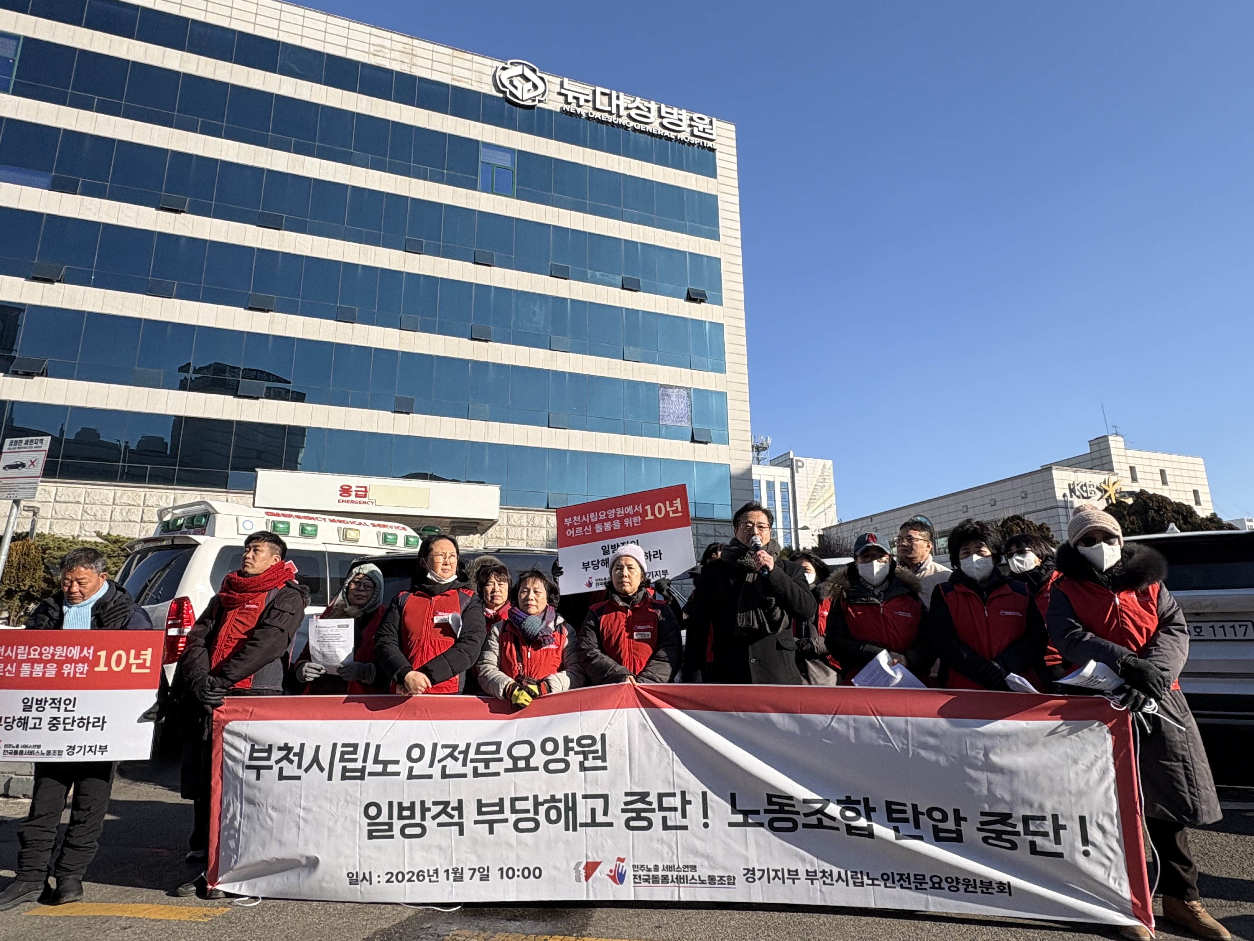 Áøº¸´ç ÀÌÁ¾¹® ºÎõ½ÃÀÇ¿ø(¾à´ëµ¿¡¤Áß1¡¤2¡¤3¡¤4µ¿)Àº 7ÀÏ ¿ÀÀü ´º ´ë¼ºº´¿ø ¾Õ¿¡¼ Àü±¹¿ä¾ç¼ºñ½º³ëµ¿Á¶ÇÕ ºÎõ½Ã¸³¿ä¾ç¿øÁöȸ(ÀÌÇÏ ³ëÁ¶)¿Í ±âÀÚȸ°ßÀ» ¿°í, "ºÎõ½Ã À¯ÀÏÇÑ ½Ã¸³¿ä¾ç½Ã¼³ÀÎ ºÎõ½Ã³ëÀÎÀü¹®¿ä¾ç¿ø¿¡¼ ¡®ÃËŹÁ÷ °è¾à Á¾·á¡¯¸¦ ÀÌÀ¯·Î 10³â°£ ±Ù¹«ÇÑ ¿ä¾çº¸È£»ç°¡ »ç½Ç»ó ºÎ´çÇØ°í¸¦ ´çÇÑ »ç°ÇÀÌ ¹ú¾îÁ³´Ù."°í ÁÖÀåÇÏ¸ç ±ÔźÇß´Ù.