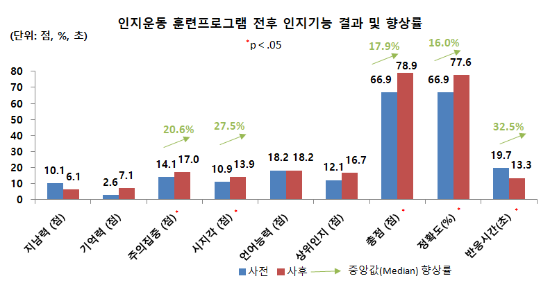 ÀÎÁö¿îµ¿ ÈÆ·ÃÇÁ·Î±×·¥ÀÇ È¿°ú¼º ºÐ¼® °á°ú, Âü¿© ³ëÀÎÀÇ Àüü ÀÎÁö±â´É Á¡¼ö Áß¾Ó°ªÀº 17.9% Çâ»óµÇ¾úÀ¸¸ç, ÁÖÀÇÁýÁß(20.6%), ½ÃÁö°¢(27.5%), Á¤È®µµ(16.0%), ¹ÝÀÀ½Ã°£(32.5%) µî ÁÖ¿ä ÀÎÁö ¿µ¿ª¿¡¼ Åë°èÀûÀ¸·Î À¯ÀǹÌÇÑ °³¼±ÀÌ È®ÀεǾú´Ù. ¶ÇÇÑ ±â¾ï·Â °³¼±¿¡¼µµ ±àÁ¤ÀûÀÎ º¯È°¡ ³ªÅ¸³µ´Ù.