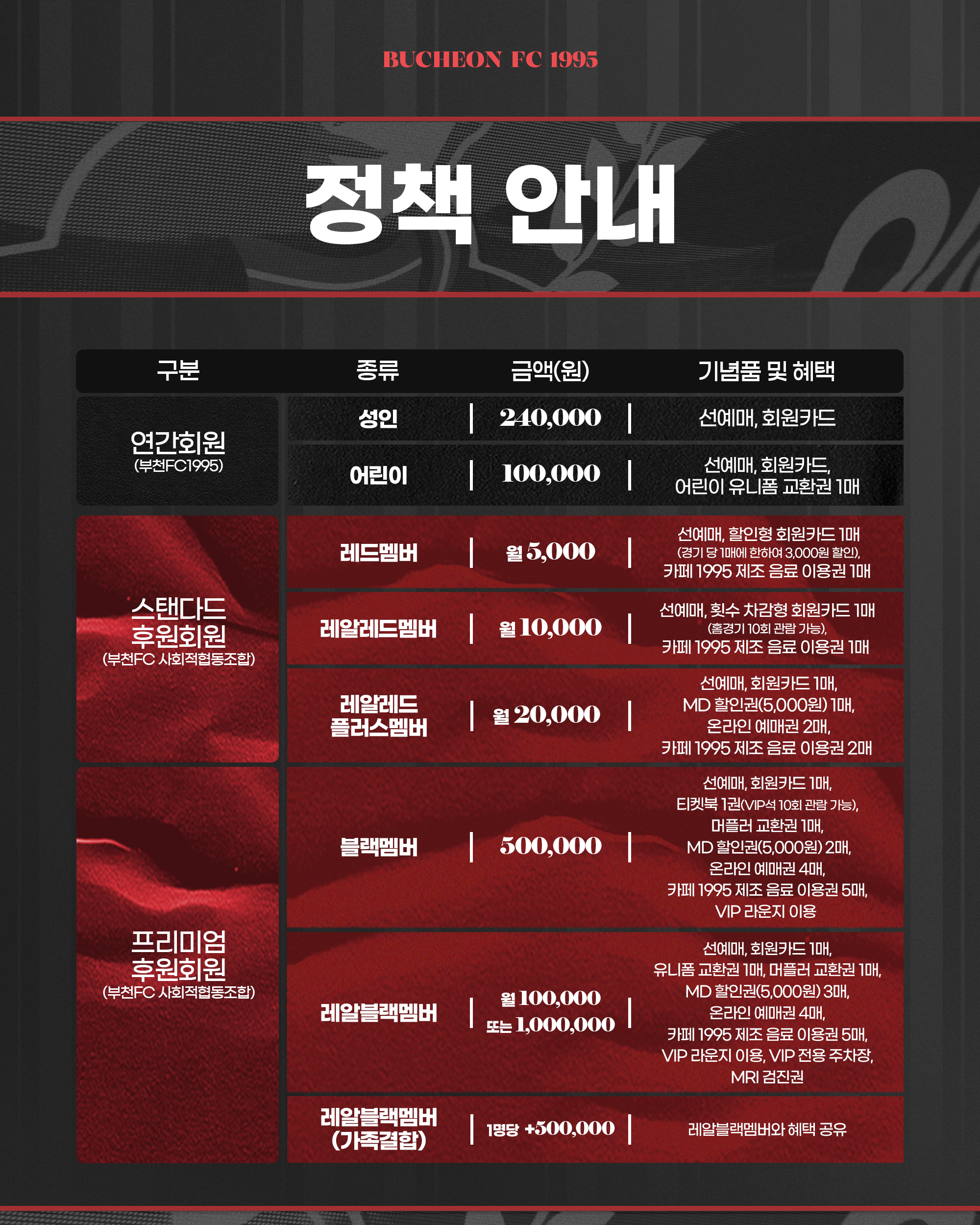 ÈÄ¿øÈ¸¿øÀº ÈÄ¿ø ±Ý¾×°ú ÇýÅÿ¡ µû¶ó ´Ù¾çÇÑ µî±ÞÀ¸·Î ¿î¿µµÈ´Ù. ·¹µå¸â¹ö´Â ¿ù 5,000¿ø, ·¹¾Ë·¹µå¸â¹ö´Â ¿ù 1¸¸ ¿ø, ·¹¾Ë·¹µåÇ÷¯½º¸â¹ö´Â ¿ù 2¸¸ ¿øÀÇ Á¤±âÈÄ¿ø ¹æ½ÄÀ¸·Î °¡ÀÔÇÒ ¼ö ÀÖ´Ù. ºí·¢¸â¹ö´Â 50¸¸ ¿ø ÀϽó³À¸·Î ¿î¿µµÇ¸ç, ·¹¾Ëºí·¢¸â¹ö´Â ¿ù 10¸¸ ¿ø Á¤±â³³ ¶Ç´Â 100¸¸ ¿ø ÀϽó³ Áß ¼±ÅÃÇÒ ¼ö ÀÖ´Ù. °¡Á·°áÇÕÇü ·¹¾Ëºí·¢¸â¹ö´Â 1ÀÎ Ãß°¡ ½Ã 50¸¸ ¿øÀÌ Ãß°¡µÈ´Ù.