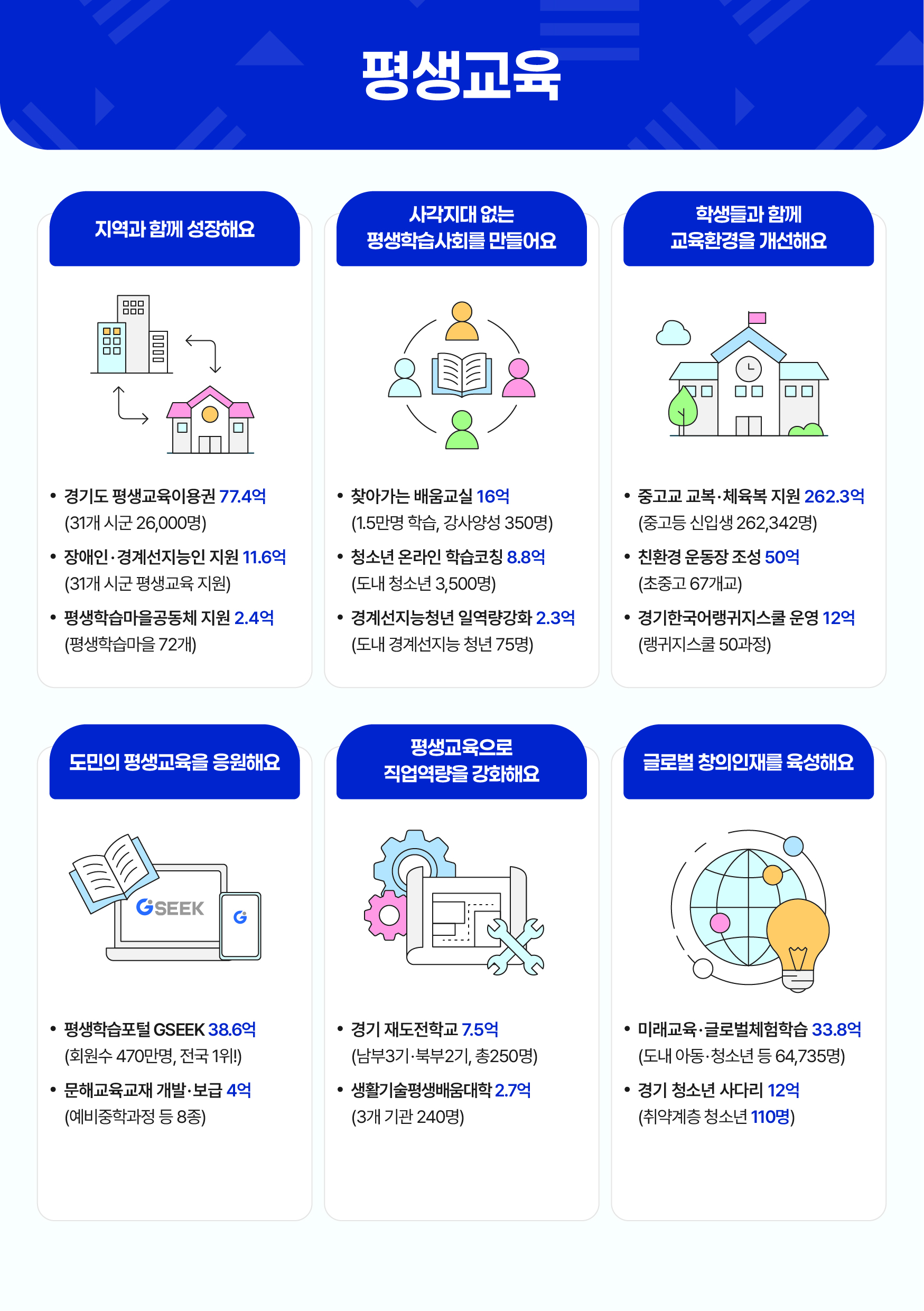 31°³ ½Ã±º¿¡ À§Ä¡ÇÑ Àå¾ÖÀÎÆò»ý±³À°½Ã¼³¿¡ ÇÁ·Î±×·¥ ¿î¿µºñ¿Í Æò»ý±³À°»ç ÀΰǺñ¸¦ Áö¿øÇØ ´Ù¾çÇÑ Æò»ýÇнÀ ±âȸ¸¦ Á¦°øÇÑ´Ù. ¶ÇÇÑ °æ±âµµ Æò»ý±³À°ÁøÈï¿ø ³» °æ°è¼±Áö´ÉÀÎ Æò»ý±³À° Áö¿ø¼¾Å͸¦ ¼³Ä¡ÇÔÀ¸·Î½á º¹Áö »ç°¢Áö´ë¿¡ ³õÀÎ °æ°è¼±Áö´ÉÀÎÀÇ ÀÚ¸³°ú »çȸÂü¿© Áö¿ø¿¡ Èû¾µ °èȹÀÌ´Ù.