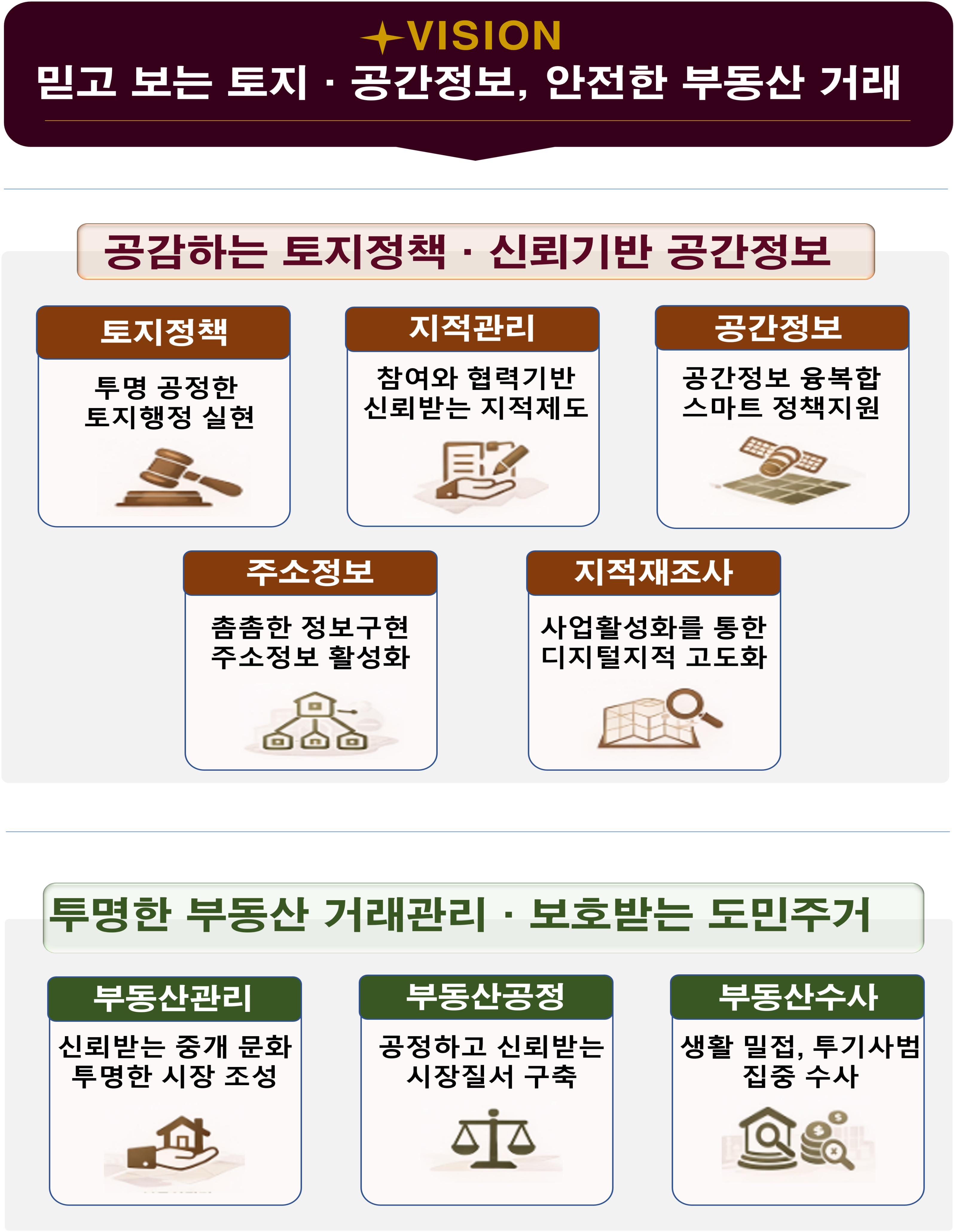 ÃßÁø°èȹÀº ¡ãÅõ¸íÇÏ°í ±ÕÇü ÀâÈù Á¦µµ ¿î¿µÀ¸·Î ½Å·Ú¹Þ´Â ÅäÁöÇàÁ¤ ½ÇÇö ¡ãÂü¿©¿Í Çù·ÂÀ» ÅëÇÑ ½Å·Ú¹Þ´Â ÁöÀûÁ¦µµ Á¤Âø ¡ã°ø°£Á¤º¸ À¶¡¤º¹ÇÕÀ» ÅëÇÑ ½º¸¶Æ®ÇÑ Á¤Ã¥ Áö¿ø ¡ãÃÎÃÎÇÑ ÁÖ¼ÒÁ¤º¸ ±¸Çö ¹× ÁÖ¼ÒÁ¤º¸ Ȱ¼ºÈ­ ÃßÁø ¡ã»ç¾÷Ȱ¼ºÈ­¸¦ ÅëÇÑ µðÁöÅÐÁöÀû °íµµÈ­ ¡ã½Å·Ú¹Þ´Â Áß°³ ¹®È­¿Í Åõ¸íÇÑ ºÎµ¿»ê ½ÃÀå Á¶¼º ¡ã°øÁ¤ÇÏ°í ½Å·Ú¹Þ´Â ½ÃÀåÁú¼­ ±¸Ãà ¡ã»ýȰ¹ÐÁ¢, Åõ±â»ç¹ü ÁýÁß¼ö»ç µî 8´ë Àü·«À» ¹ÙÅÁÀ¸·Î ÇÑ 92°³ ¼¼ºÎ ÀÌÇà°úÁ¦·Î ±¸¼ºµÆ´Ù.