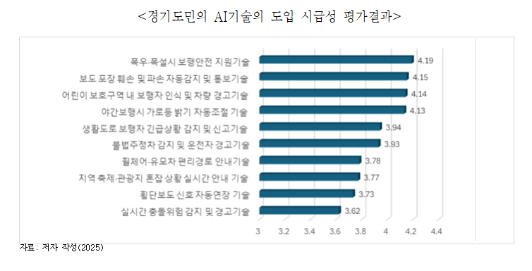 °æ±â¿¬±¸¿øÀÌ °æ±âµµ¹Î 1,000¸íÀ» ´ë»óÀ¸·Î ¼³¹®Á¶»ç¸¦ ÇÑ °á°ú, µµ¹ÎµéÀº º¸Çà ¾ÈÀüÀ» ¸Å¿ì Áß¿äÇÏ°Ô »ý°¢ÇÏÁö¸¸ ÇöÀçÀÇ ¾ÈÀü °³¼± ¼öÁØ¿¡´Â ¸¸Á·µµ°¡ ³ôÁö ¾ÊÀº °ÍÀ¸·Î ³ªÅ¸³µ´Ù. µµ¹ÎµéÀÌ °¡Àå ÇÊ¿äÇÏ´Ù°í ²ÅÀº AI ±â¼úÀº ¡®Æø¿ì³ª Æø¼³ ½Ã º¸Çà ¾ÈÀü Áö¿ø ±â¼ú¡¯(4.19Á¡/5Á¡ ¸¸Á¡)À̾úÀ¸¸ç, ¡®¸Á°¡Áø º¸µµºí·Ï ÀÚµ¿ °¨Áö¡¯(4.15Á¡), ¡®¾î¸°ÀÌ º¸È£±¸¿ª ³» À§Çè °æ°í¡¯(4.14Á¡) µîÀÌ ±× µÚ¸¦ À̾ú´Ù.