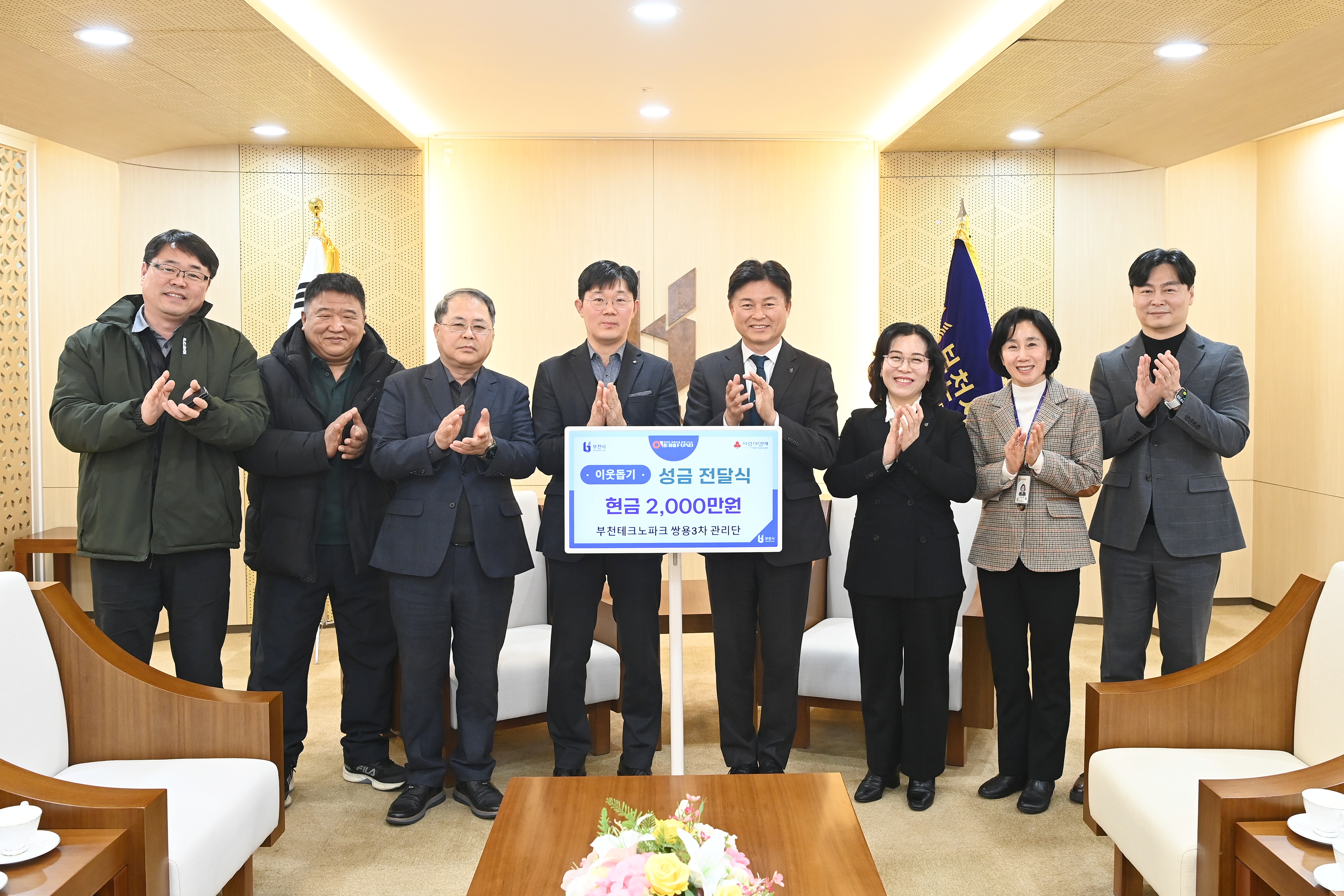 ºÎõ½Ã´Â Áö³ 22ÀÏ ºÎõÅ×Å©³ëÆÄÅ© ½Ö¿ë3Â÷ °ü¸®´ÜÀÌ ¼º±Ý 2,000¸¸ ¿øÀ» ±âŹÇß´Ù°í 23ÀÏ ¹àÇû´Ù. Àü´Þ½Ä¿¡´Â ±èÁ¾Çå ½Ö¿ë3Â÷ °ü¸®´Ü ȸÀåÀ» ºñ·ÔÇÑ °ü¸®´Ü °ü°èÀÚµéÀÌ Âü¼®ÇØ Â÷´ãÀ» ³ª´©°í ±â³ä ÃÔ¿µÀ» ÁøÇàÇß´Ù.