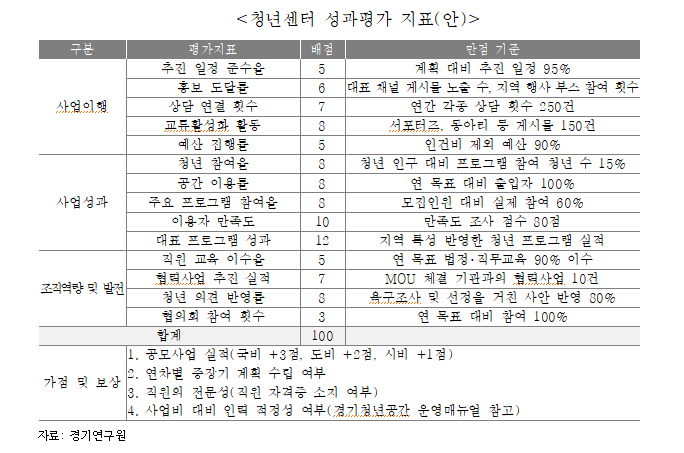 ¿¬±¸Ã¥ÀÓÀÚÀÎ ¿ÀÀçÈ£ °æ±â¿¬±¸¿ø ¼±ÀÓ¿¬±¸À§¿øÀº ¡°Ã»³â¼¾ÅÍ ¼º°ú°ü¸®´Â ¼ýÀÚ¸¦ ä¿ì±â À§ÇÑ Æò°¡°¡ ¾Æ´Ï¶ó, û³âÀÇ »îÀÌ ½ÇÁ¦·Î ³ª¾ÆÁ³´ÂÁö¸¦ È®ÀÎÇÏ´Â µµ±¸¡±¶ó¸ç ¡°±ºÆ÷½Ã »ç·Ê´Â ´Ù¸¥ ±âÃÊÀÚÄ¡´Üüµµ ¹«¸® ¾øÀÌ Àû¿ëÇÒ ¼ö ÀÖ´Â Çö½ÇÀûÀÎ ±âÁØÀ» Á¦½ÃÇÑ ¸¸Å, ´Ü°èÀûÀ¸·Î µµÀÔÇØ Á¤Ã¥ È¿°ú¸¦ ³ôÀÌ´Â µ¥ Ȱ¿ëÇÏ±æ ¹Ù¶õ´Ù¡±°í Á¶¾ðÇß´Ù.