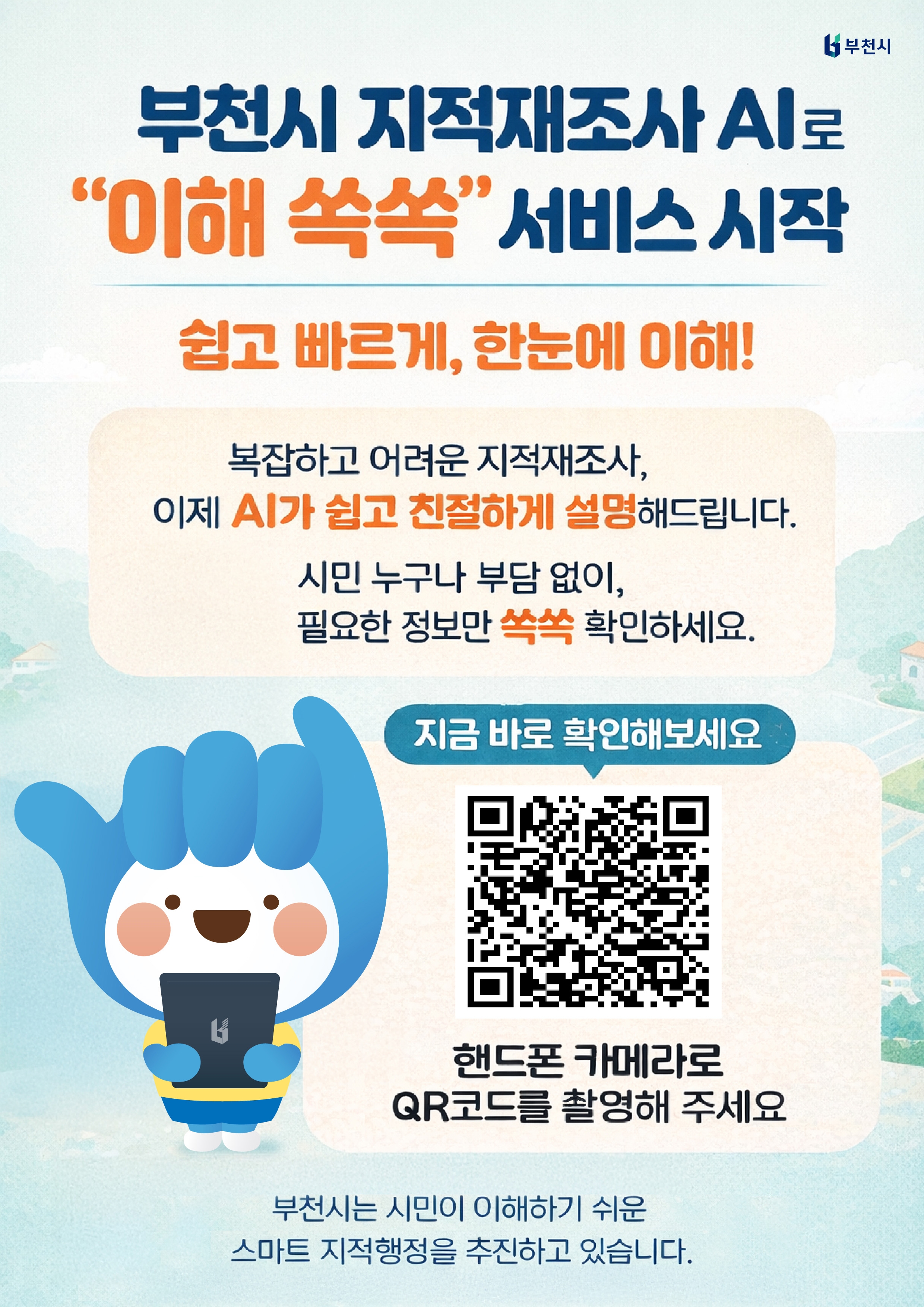 ºÎõ½Ã´Â ¿À´Â 2¿ùºÎÅÍ ÁöÀûÀçÁ¶»ç »ç¾÷ÀÇ º¹ÀâÇÑ ³»¿ëÀ» ½Ã¹Î°ú ´ã´ç °ø¹«¿øÀÌ ½±°Ô ÀÌÇØÇÒ ¼ö ÀÖµµ·Ï, AI ±â¹Ý ÀÚ·áºÐ¼® µµ±¸¸¦ Ȱ¿ëÇÑ ÁöÀûÀçÁ¶»ç ¾È³» ¼ºñ½º ¡®ÀÌÇØ ½ï½ï¡¯À» ¿î¿µÇÑ´Ù.