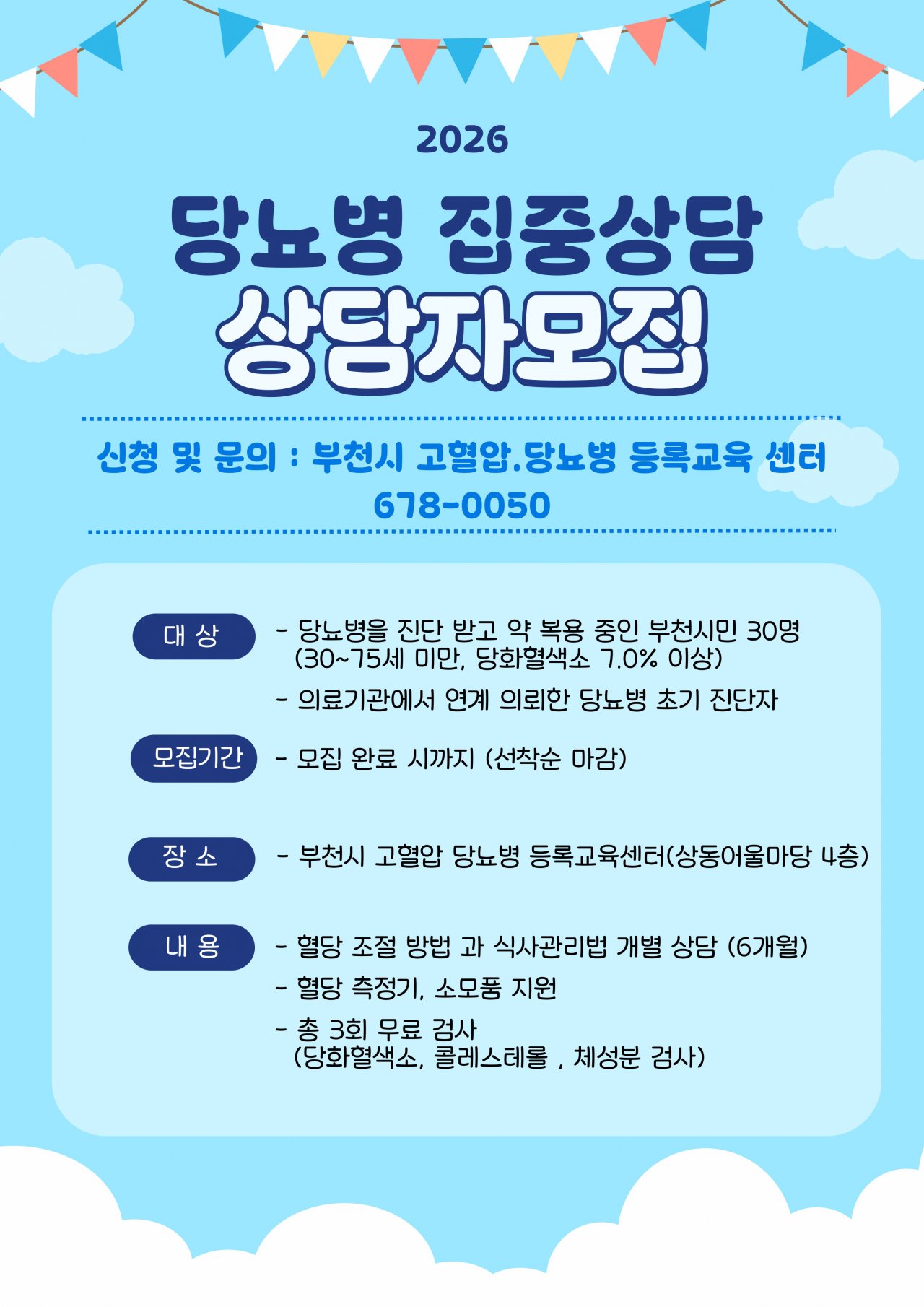 ½Åû ´ë»óÀº 30¼¼ ÀÌ»ó 75¼¼ ¹Ì¸¸À¸·Î, ´çÈ­Ç÷»ö¼Ò 7.0% ÀÌ»óÀÎ ´ç´¢º´À» Áø´Ü¹ÞÀº ºÎõ½Ã¹ÎÀÌ´Ù. Âü¿©ÀÚ·Î ¼±Á¤µÇ¸é °£È£»ç¿Í ¿µ¾ç»ç·Î ±¸¼ºµÈ °Ç°­¸Å´ÏÀú°¡ ÆÀÀ» ÀÌ·ï 6°³¿ù°£ °³º° ¸ÂÃãÇü °ü¸®¸¦ Áö¿øÇÑ´Ù. ½ÅûÀº À¯¼±(032-678-0050)À» ÅëÇØ °¡´ÉÇϸç, ¸ðÁýÀº ¼±Âø¼øÀ¸·Î ¿Ï·á ½Ã±îÁö ÁøÇàµÈ´Ù.