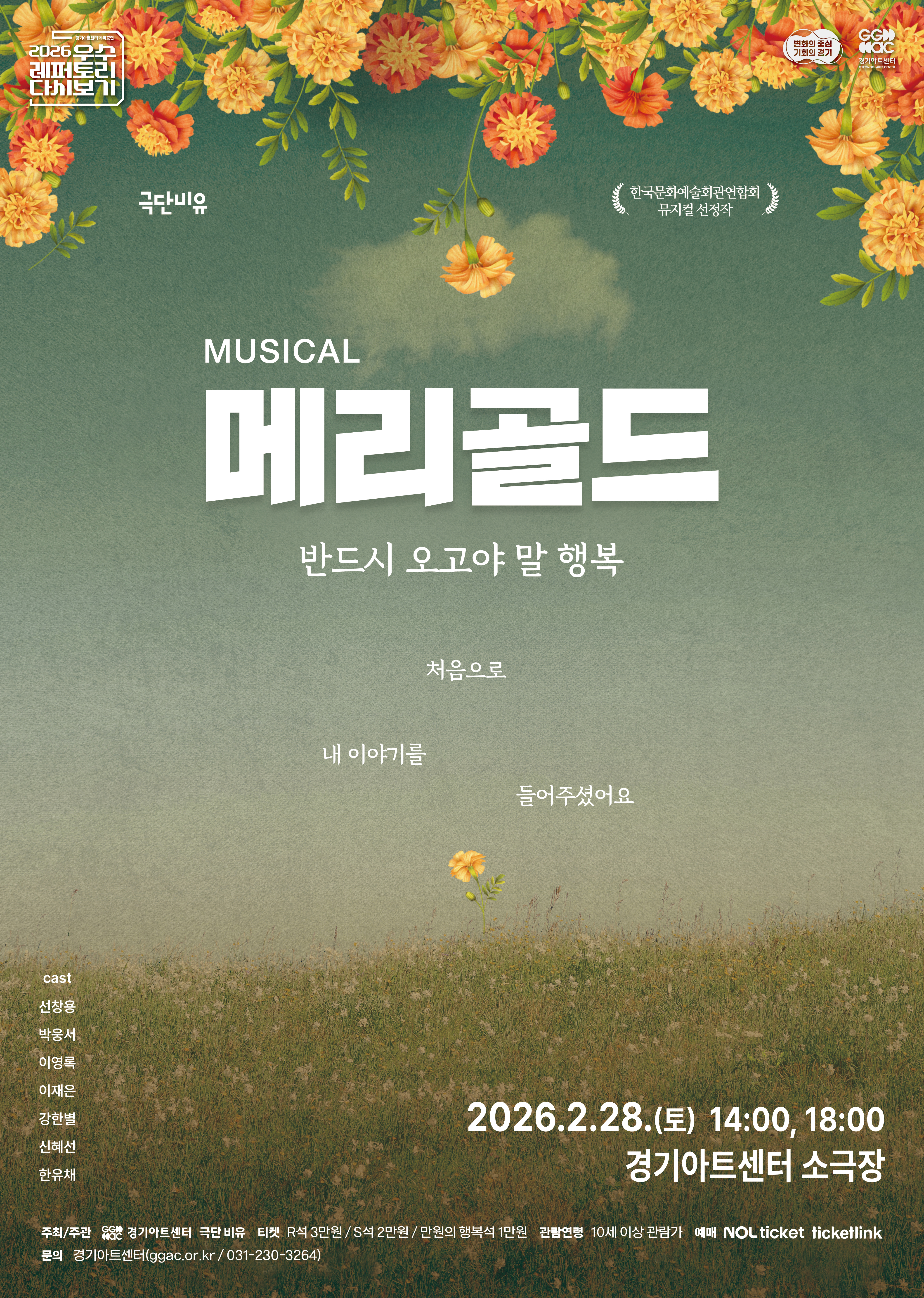 °æ±â¾ÆÆ®¼¾ÅÍ(»çÀå ±è»óȸ)´Â °ø¿¬Àå Ȱ¼ºÈ¸¦ À§ÇÑ ¡®¿ì¼ö ·¹ÆÛÅ丮 ´Ù½Ãº¸±â¡¯ ÇÁ·Î±×·¥ÀÇ ÀÏȯÀ¸·Î, ¹ÂÁöÄà <¸Þ¸®°ñµå>¸¦ ¿À´Â 2¿ù 28ÀÏ(Åä) ¿ÀÈÄ 2½Ã¿Í 6½Ã, °æ±â¾ÆÆ®¼¾ÅÍ ¼Ò±ØÀå¿¡¼ ¼±º¸ÀδÙ.