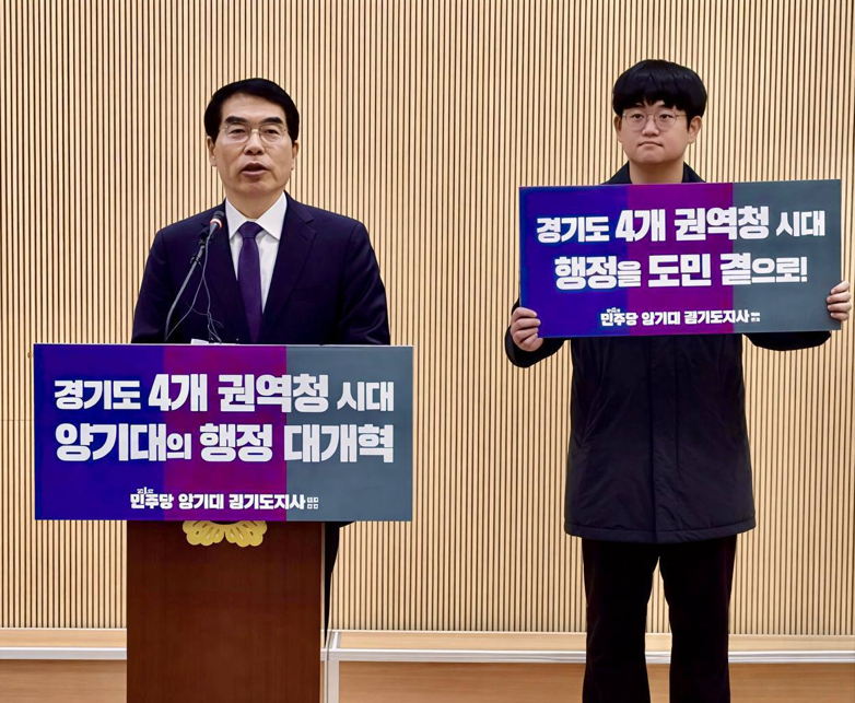 °æ±âµµÁö»ç ¿¹ºñÈĺ¸ ¾ç±â´ë Àü ´õºÒ¾î¹ÎÁÖ´ç ±¹È¸ÀÇ¿øÀº 4ÀÏ 1,400¸¸ °æ±âµµ¹ÎÀÇ »îÀÇ ÁúÀ» ȹ±âÀûÀ¸·Î ³ôÀ̱â À§ÇØ °æ±âµµ ÇàÁ¤À» 4°³ ±Ç¿ªº° ÇàÁ¤Ã» üÁ¦·Î Àü¸é °³ÆíÇÏ´Â ¡®ÇàÁ¤ ´ë°³Çõ¡¯ °ø¾àÀ» ¹ßÇ¥Çß´Ù.