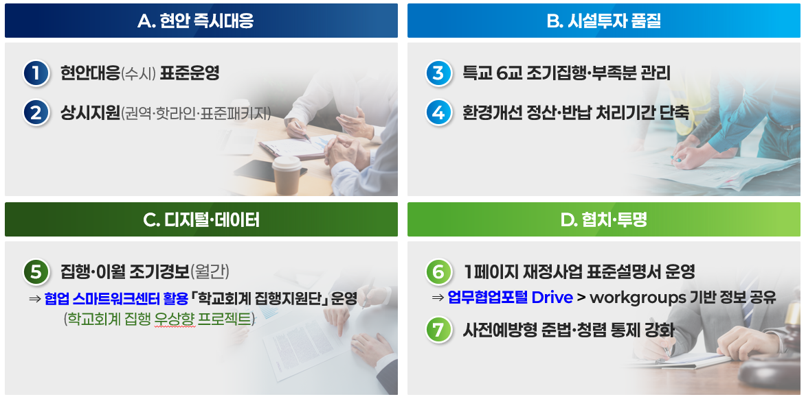 À̸¦ À§ÇØ ¡ãÇö¾È Áï½Ã´ëÀÀ ¡ã½Ã¼³ÅõÀÚ Ç°Áú ¡ãµðÁöÅÐ ±â¹Ý ÁýÇà°ü¸® ¡ãÇùÄ¡¡¤Åõ¸í ÀçÁ¤¿î¿µÀÇ 4´ë ºÐ¾ß¸¦ Áß½ÉÀ¸·Î ü°èÀûÀÎ ÀçÁ¤ ¿î¿µÀ» ÃßÁøÇÑ´Ù.