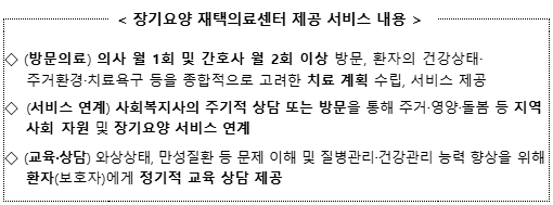 Àå±â¿ä¾ç ÀçÅÃÀÇ·á¼¾ÅÍ ½Ã¹ü»ç¾÷Àº ÀÇ»ç, °£È£»ç, »çȸº¹Áö»ç°¡ ÇÑ ÆÀÀ¸·Î Àå±â¿ä¾çº¸Çè ¼ö±ÞÀÚÀÇ °¡Á¤À» ¹æ¹®ÇÏ¿© ÀǷἺñ½º¸¦ Á¦°øÇϰí, ÇÊ¿äÇÑ Áö¿ª»çȸ µ¹º½¼ºñ½º µîÀ» ¿¬°èÇÏ´Â »ç¾÷ÀÌ´Ù. À̸¦ ÅëÇØ °Åµ¿ÀÌ ºÒÆíÇÑ ¾î¸£½ÅµéÀÌ ¿ä¾çº´¿ø µî¿¡ ÀÔ¿øÇϰųª ¿ä¾ç½Ã¼³¿¡ ÀÔ¼ÒÇÏÁö ¾Ê°íµµ, ÇÊ¿äÇÑ ÀǷἺñ½º¸¦ ¹ÞÀ» ¼ö ÀÖ´Ù.