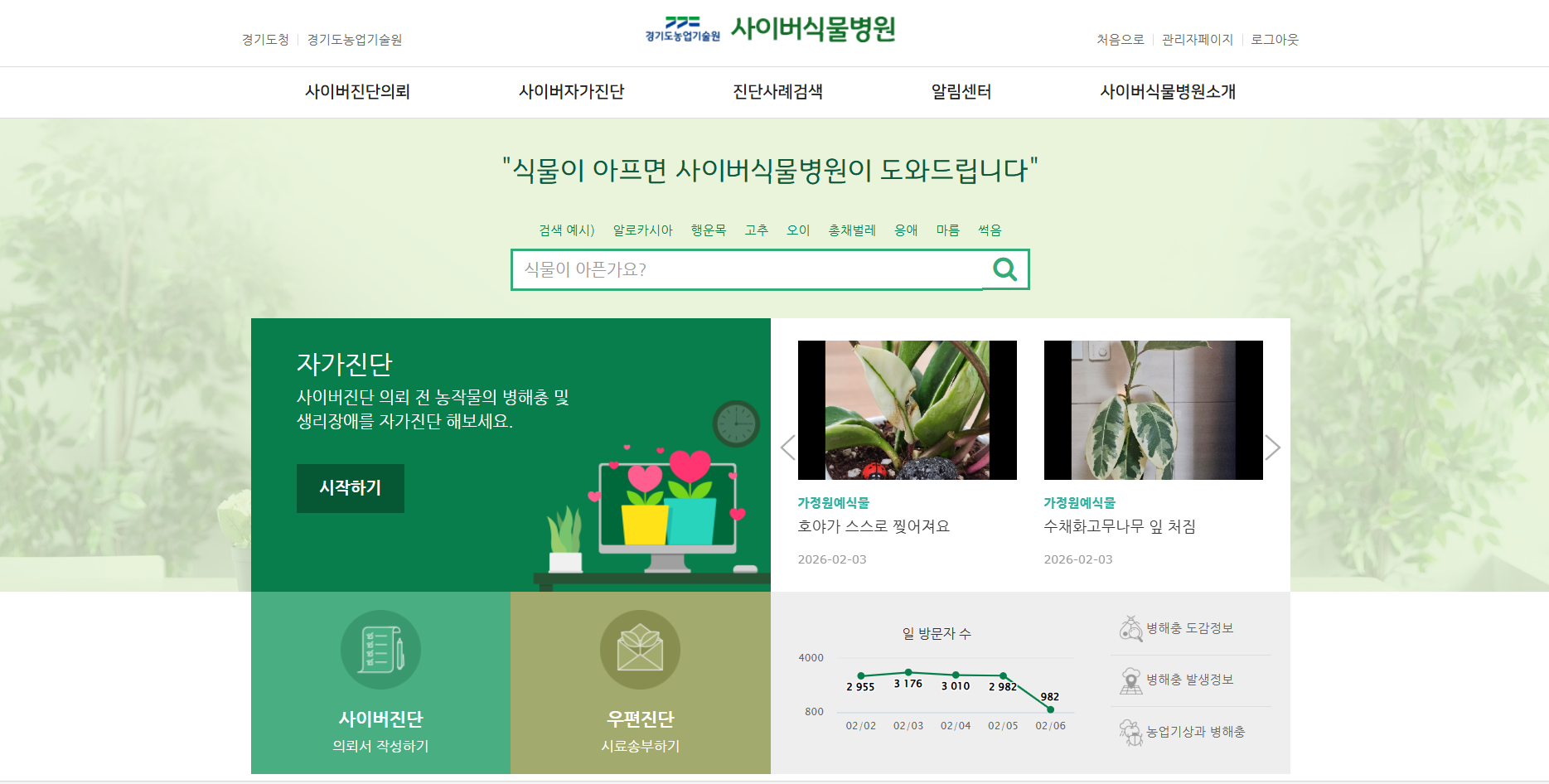 »çÀ̹ö½Ä¹°º´¿øÀº ½Ä¹°ÀÇ ÀÌ»ó Áõ»ó »çÁø°ú Àç¹è Á¤º¸¸¦ ¿Â¶óÀÎÀ¸·Î µî·ÏÇϸé Àü¹®°¡°¡ ¿øÀÎÀ» Áø´ÜÇØ ÁÖ´Â ¼ºñ½º´Ù. 2025³â ±âÁØ ¿¬°£ ¹æ¹® °Ç¼ö´Â ¾à 111¸¸ °Ç¿¡ À̸£¸ç, ¹Ý·Á ½Ä¹° ½ÃÀå È®´ë¿¡ µû¶ó °ü·Ã Áø´ÜÀÇ·Ú°¡ ²ÙÁØÈ÷ Áõ°¡Çϰí ÀÖ´Ù.