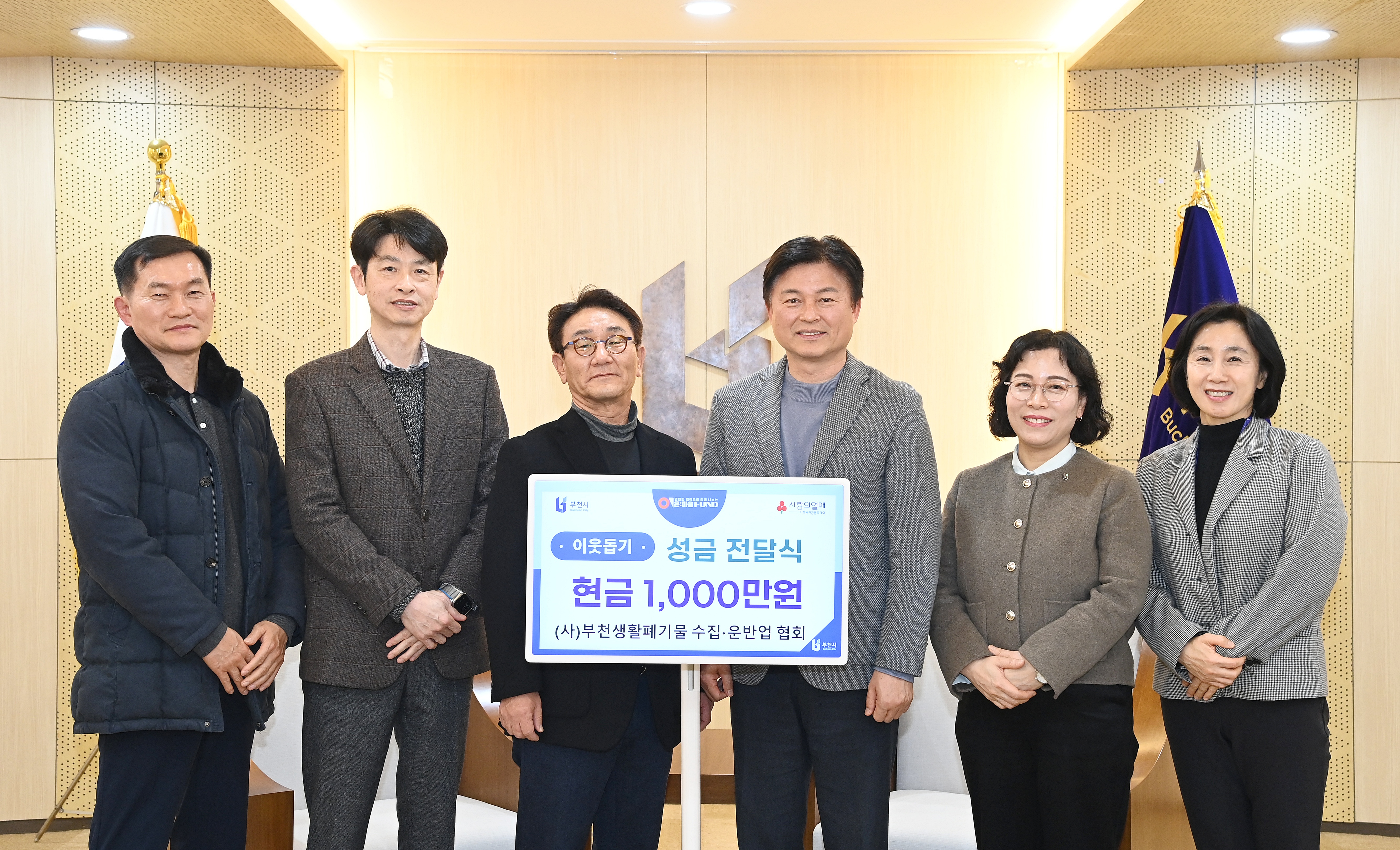 ºÎõ½Ã´Â ÃÖ±Ù (»ç)ºÎõ»ýȰÆó±â¹°¼öÁý¡¤¿î¹Ý¾÷Çùȸ·ÎºÎÅÍ ¼º±Ý 1,000¸¸ ¿øÀ» ±âŹ¹Þ¾Ò´Ù°í 19ÀÏ ¹àÇû´Ù. Àü´Þ½Ä¿¡´Â ¿°±âµ¿ ÀÌ»çÀåÀ» ºñ·ÔÇØ ±è°æ°ü °¨»ç, ¼³°üÁ¾ »ç¹«±¹Àå µî Çùȸ °ü°èÀÚ 3¸íÀÌ Âü¼®Çß´Ù.