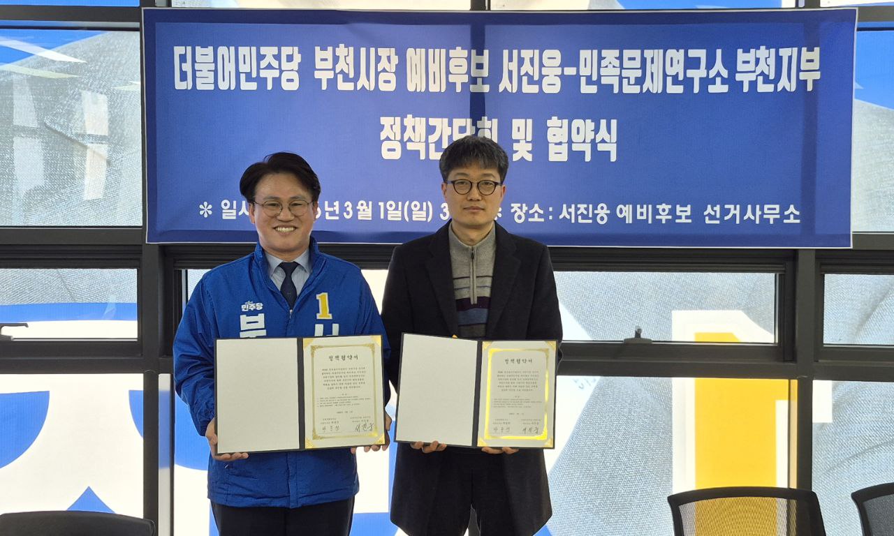 ¼Áø¿õ ´õºÒ¾î¹ÎÁÖ´ç ºÎõ½ÃÀå ¿¹ºñÈ帴 3¿ù 1ÀÏ ¿ÀÈÄ 3½Ã ¿¹ºñÈĺ¸ ¼±°Å»ç¹«¼Ò¿¡¼ ¹ÎÁ·¹®Á¦¿¬±¸¼Ò ºÎõÁöºÎ ¹ÚÁ¾¼± ÁöºÎÀå ¹× °ü°èÀÚµéÀÌ Âü¼®ÇÑ °¡¿îµ¥ ¹ÎÁ·¹®Á¦¿¬±¸¼Ò ºÎõÁöºÎ¿Í Á¤Ã¥Çù¾à½ÄÀ» °¡Áö°í ºÎõ½ÃÀå¿¡ ´ç¼±µÉ °æ¿ì ºÎõ½ÃÀÇ ÀÏÁ¦°Á¡±â Ç×ÀϿÀ» Á¦´ë·Î ¾Ë¸®±â À§ÇÑ Á¤Ã¥ °øÁ¶ ¹× »ç¾÷Áö¿ø¿¡ ÇÕÀÇÇß´Ù.