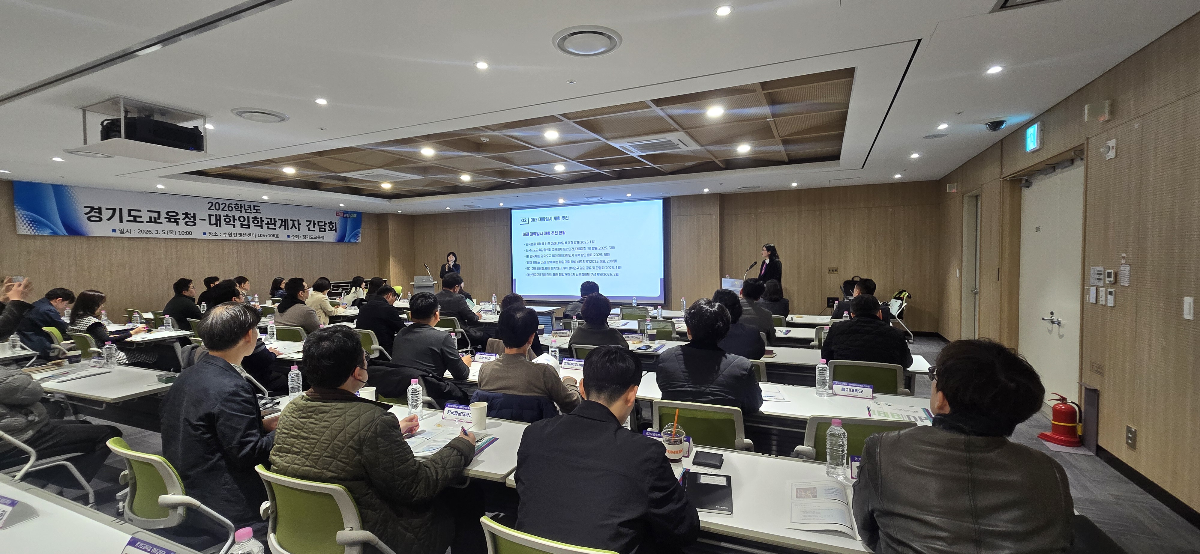 µµ±³À°Ã»Àº 5ÀÏ ¼ö¿øÄÁº¥¼Ç¼¾ÅÍ¿¡¼­ ¡®2026Çг⵵ ´ëÇÐÀÔÇаü°èÀÚ °£´ãȸ¡¯¸¦ ¿­°í °æ±âµµ¸¸ÀÇ Æ¯»ö ÀÖ´Â ÁøÇб³À° Á¤Ã¥À» ´ëÇÐ Ãø¿¡ ¾È³»Çß´Ù. °£´ãȸ¿¡´Â µµ±³À°Ã» ´ëÀÔÁøÇÐ ¹× ±³À°°úÁ¤ ´ã´çÀÚ¿Í ¼öµµ±Ç ¼ÒÀç 4³âÁ¦ ´ëÇÐ ÀÔÇаü°èÀÚ 50¿© ¸íÀÌ Âü¼®ÇØ ¼ÒÅëÀÇ ½Ã°£À» ÇÔ²²Çß´Ù.