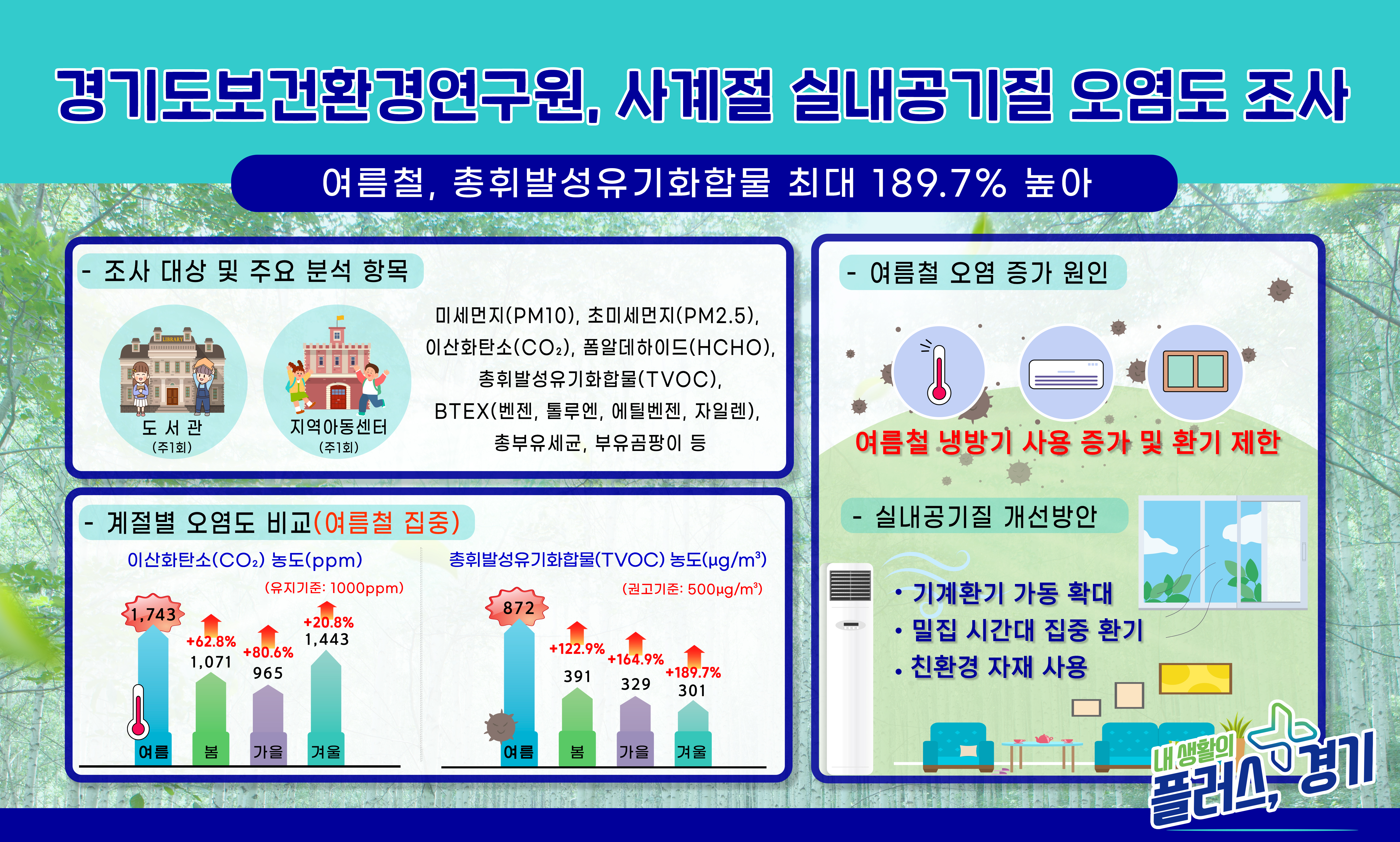 Áö³ÇØ ÀÏ ³â°£ µ¿ÀÏ ÁöÁ¡¿¡¼ ½Ç³» °ø±âÁú ¿À¿°¹°ÁúÀ» Á¶»çÇÑ °á°ú, ¿©¸§Ã¶ ÀÌ»êÈź¼Ò Æò±Õ ³óµµ´Â 1,743ppmÀ¸·Î, º½Ã¶(1,071ppm) ´ëºñ 62.8%, °¡À»Ã¶(965ppm) ´ëºñ 80.6%, °Ü¿ïö(1,443ppm) ´ëºñ 20.8% ³ô¾Ò´Ù. ¿©¸§Ã¶ ÃÑÈֹ߼ºÀ¯±âÈÇÕ¹° Æò±Õ ³óµµ´Â 872¥ìg/m©ø·Î, º½Ã¶(391¥ìg/m©ø) ´ëºñ 122.9%, °¡À»Ã¶(329¥ìg/m©ø) ´ëºñ 164.9%, °Ü¿ïö(301¥ìg/m©ø) ´ëºñ 189.7% ³ô°Ô ³ªÅ¸³µ´Ù.