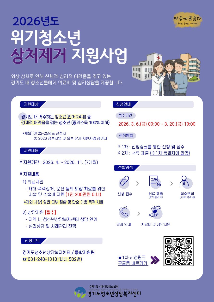 Áö¿ø ´ë»óÀº °æ±âµµ¿¡ Áֹεî·ÏÀ» µÐ 9~24¼¼ û¼Ò³âÀÌ´Ù. µµ´Â °æÁ¦Àû ¾î·Á¿ò°ú »óó Ư¼º, Ä¡·á µ¿±â¿Í ÀÇÁö µîÀ» °í·ÁÇØ ÃÖÁ¾ ´ë»óÀÚ¸¦ ¼±Á¤Çϰí, ÃÖ´ë 200¸¸ ¿øÀÇ Ä¡·áºñ¿Í Áö¿ª û¼Ò³â»ó´ãº¹Áö¼¾ÅÍ ¿¬°è ½É¸®»ó´ã ¼­ºñ½º¸¦ ÇÔ²² Á¦°øÇÒ °èȹÀÌ´Ù.