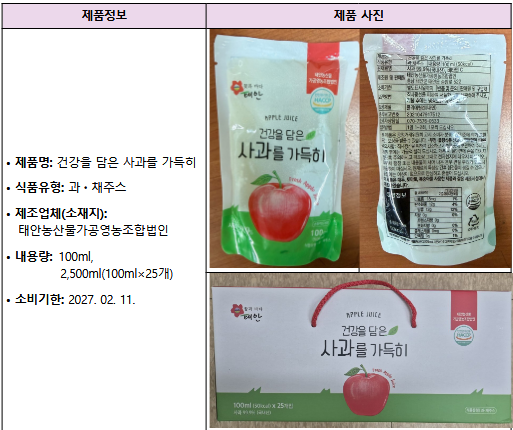 ½ÄǰÀǾàǰ¾ÈÀüó´Â ½ÄǰÁ¦Á¶¡¤°¡°ø¾÷üÀÎ ¡®Å¾ȳó»ê¹°°¡°ø¿µ³óÁ¶ÇÕ¹ýÀÎ(ÃæÃ»³²µµ žȱº ¼ÒÀç)¡¯ÀÌ Á¦Á¶¡¤ÆÇ¸ÅÇÑ ¡®°Ç°­À» ´ãÀº »ç°ú¸¦ °¡µæÈ÷(½ÄǰÀ¯Çü : °ú¡¤Ã¤ÁÖ½º)¡¯¿¡¼­ ³³ÀÌ ±âÁغ¸´Ù Ãʰú °ËÃâµÇ¾î ÇØ´ç Á¦Ç°À» ÆÇ¸Å Áß´ÜÇϰí ȸ¼ö Á¶Ä¡ÇÑ´Ù°í 3¿ù 6ÀÏ ¹àÇû´Ù.