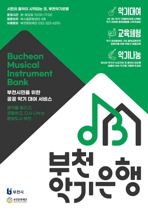 <ºÎõ¾Ç±âÀºÇà>Àº °æÁ¦Àû ºÎ´ãÀ̳ª Á¢±Ù¼º ¹®Á¦·Î ¾Ç±â ¿¬ÁÖ¸¦ ¸Á¼³¿´´ø ½Ã¹Î¿¡°Ô Àú·ÅÇÑ ºñ¿ëÀ¸·Î ¾Ç±â¸¦ ´ë¿©Çϰí À½¾Ç Ȱµ¿ ±âȸ¸¦ Á¦°øÇÏ´Â °ø°ø ¹®È¼ºñ½º´Ù. ºÎõ½Ã°¡ Á¶¼ºÇϰí Àç´ÜÀÌ ¿î¿µÇϸç, ¾Ç±â Á¢±Ù À庮À» ³·Ãç ½Ã¹ÎÀÇ ¹®È¿¹¼ú Âü¿©¸¦ È®´ëÇÑ´Ù. Àç´ÜÀº À¯ÈÞ ¾Ç±â ±âÁõÀ» ÅëÇØ ¹®ÈÀÚ¿ø ¼øÈ¯ ¸ðµ¨À» ±¸ÃàÇØ Áö¿ª»çȸ¿¡¼ À½¾ÇÀ» ³ª´©´Â ¹®È¸¦ Á¶¼ºÇÒ °èȹÀÌ´Ù.