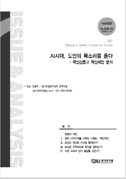 °æ±âµµ¹ÎµéÀÌ ¿ì¸® µ¿³×¸¦ ´õ »ì±â ÁÁ°Ô ¸¸µé±â À§ÇØ ½ñ¾Æ³½ ¼öõ °ÇÀÇ ¾ÆÀ̵ð¾îµéÀÌ ÀΰøÁö´É(AI)ÀÇ ´«À» ÅëÇØ ±¸Ã¼ÀûÀÎ Á¤Ã¥ Áöµµ·Î Àçź»ýÇß´Ù. °æ±â¿¬±¸¿øÀº 2022³â 7¿ùºÎÅÍ 2025³â 12¿ù±îÁö ±¹¹Î½Å¹®°í¿¡ Á¢¼öµÈ °æ±âµµ °ü·Ã ¡®±¹¹ÎÁ¦¾È¡¯ 3,143°ÇÀ» AI ±â¼ú·Î ½ÉÃþ ºÐ¼®ÇÑ º¸°í¼ ¡®AI ½Ã´ë, µµ¹ÎÀÇ ¸ñ¼Ò¸®¸¦ µè´Ù: ±¹¹Î½Å¹®°í ±¹¹ÎÁ¦¾È ºÐ¼®¡¯À» ¹ßÇ¥Çß´Ù.
