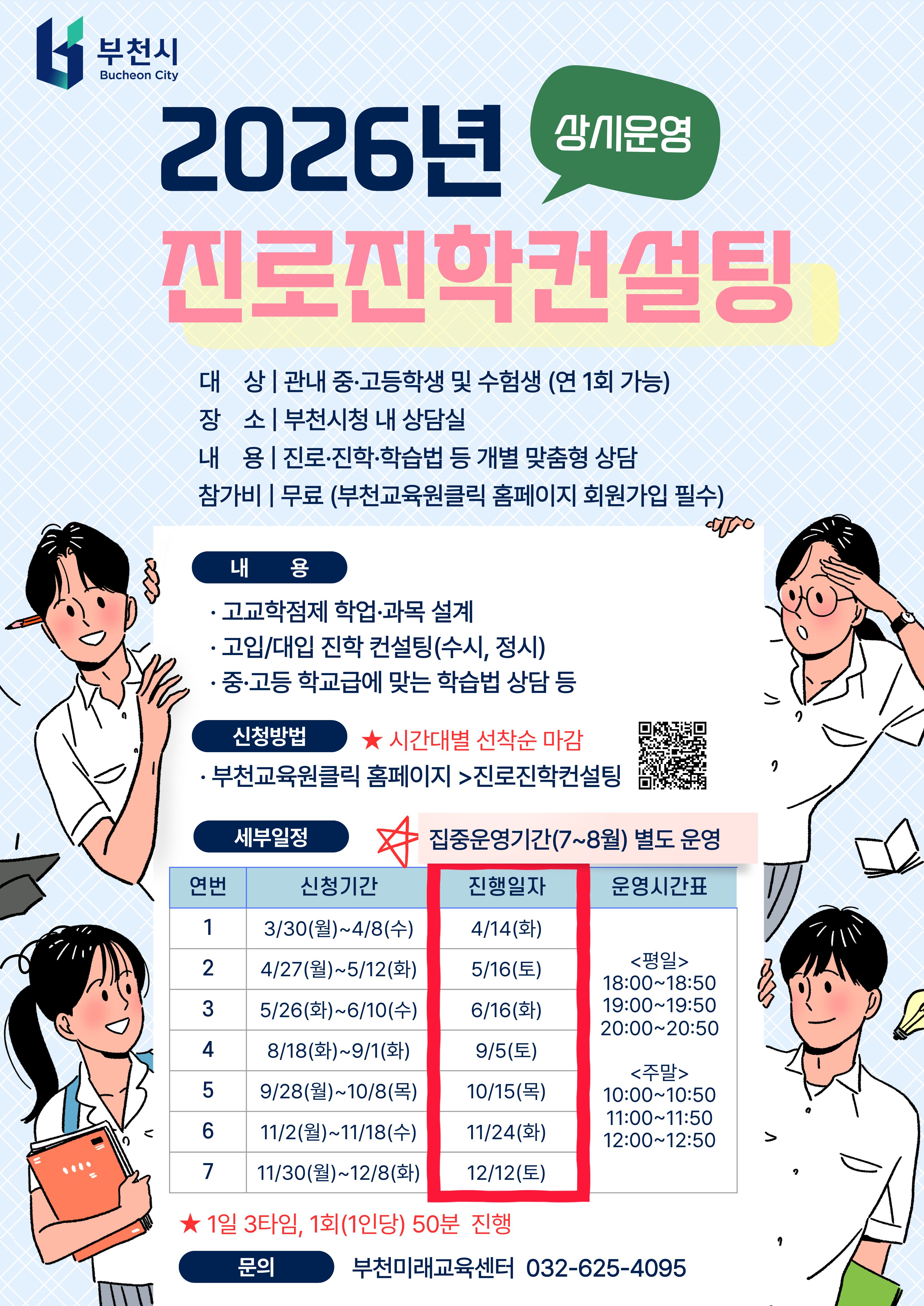 Âü¿© ´ë»óÀº ºÎõ½Ã ¼ÒÀç Áß°íµîÇлý°ú ¼öÇè»ýÀ̸ç, ¿¬ 1ȸ ½ÅûÇÒ ¼ö ÀÖ´Ù. 4¿ù 14ÀÏ Ã¹ »ó´ã Âü¿©¸¦ Èñ¸ÁÇÏ´Â ½Ã¹ÎÀº 3¿ù 30ÀϺÎÅÍ 4¿ù 8ÀϱîÁö ¡®ºÎõ±³À°¿øÅ¬¸¯¡¯ ȨÆäÀÌÁö¸¦ ÅëÇØ ¿Â¶óÀÎÀ¸·Î ½ÅûÇÏ¸é µÈ´Ù.