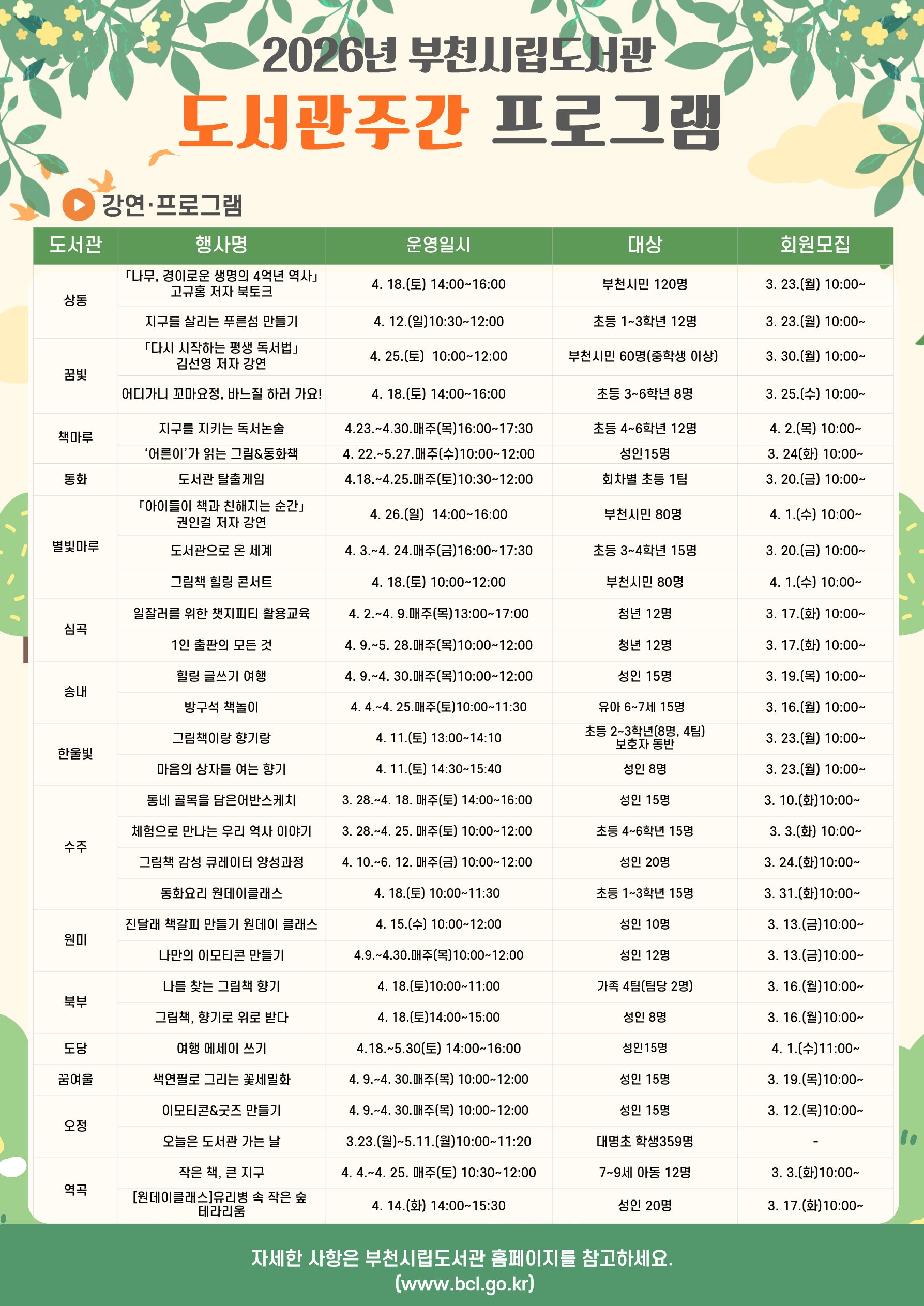 ¾ß¿Ü µ¶¼¹®È Çà»çµµ ¿¸°´Ù. 4¿ù 11ÀÏ »óµ¿µµ¼°ü ¿øÃµ°ø¿ø¿¡¼´Â ¡®±×¸°ºÏ Çø®¸¶ÄÏ¡¯À», 4¿ù 18ÀÏ ¼öÁÖµµ¼°ü °í°¼±»çÀ¯Àû°ø¿ø¿¡¼´Â ¡®°ø¿ø ¼Ó ºÏÇÇÅ©´Ð¡¯À» ¿î¿µÇØ ½Ã¹Îµé¿¡°Ô »ö´Ù¸¥ µ¶¼ °æÇèÀ» Á¦°øÇÑ´Ù. ÀÌ¿Í ÇÔ²² 4¿ù ÇÑ ´Þ µ¿¾È ºÎõ½Ã¸³¡¤°ø¸³¡¤ÀÛÀºµµ¼°ü¿¡¼´Â ¡®¿¬Ã¼ Ç®°í ¹Ù·Î¹Ù·Î ´ëÃ⡯ À̺¥Æ®µµ ÁøÇàÇÑ´Ù.