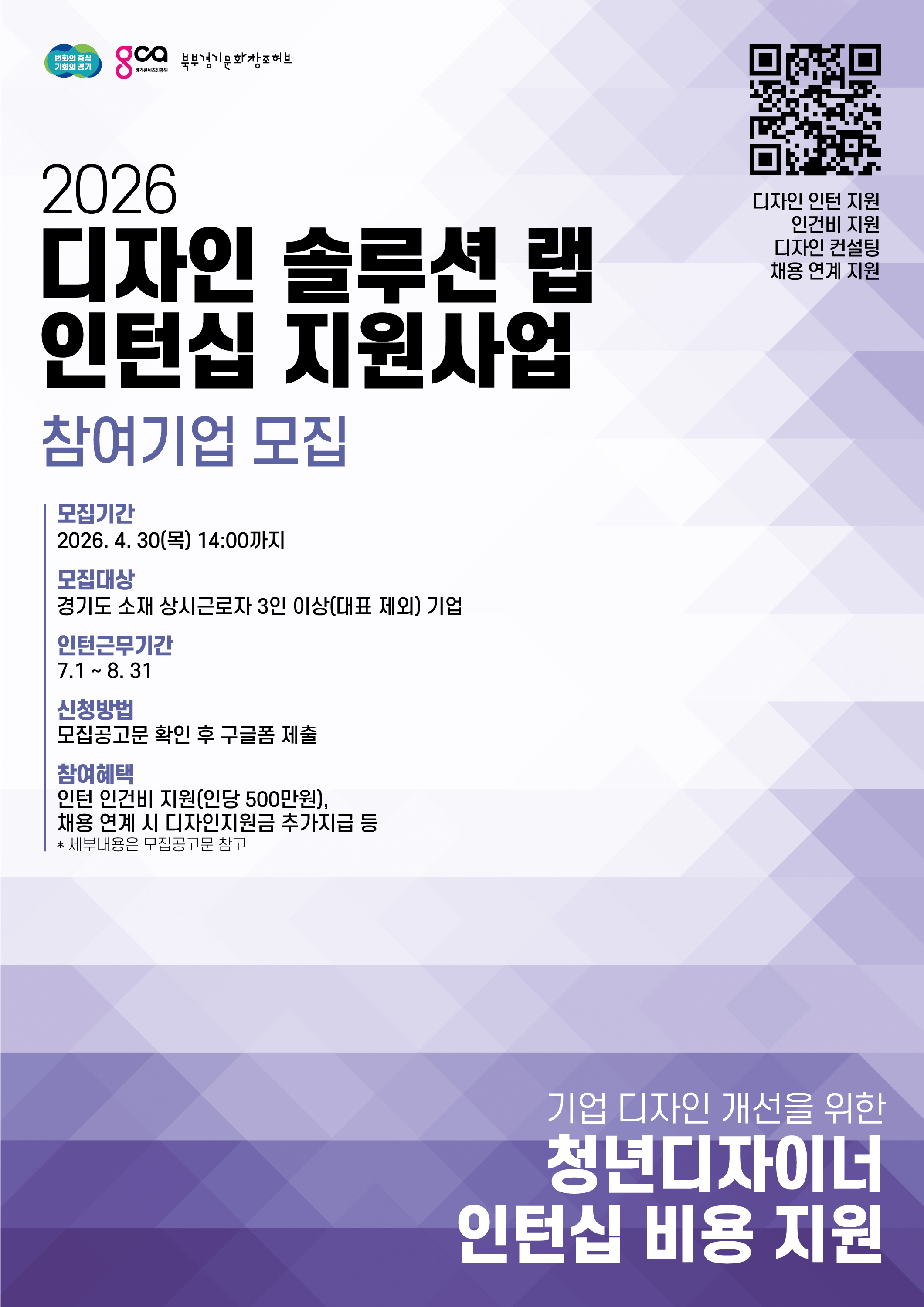 °æ±âÄÜÅÙÃ÷ÁøÈï¿ø(¿øÀå Ź¿ë¼®, ÀÌÇÏ °æÄÜÁø)Àº µµ³» ±â¾÷ÀÇ µðÀÚÀÎ °æÀï·Â °È¿Í û³â µðÀÚÀ̳ÊÀÇ ½Ç¹« ¿ª·® Çâ»óÀ» À§ÇØ <2026 µðÀÚÀÎ ¼Ö·ç¼Ç ·¦ ÀÎÅÏ½Ê Áö¿ø »ç¾÷>¿¡ Âü¿©ÇÒ ±â¾÷°ú û³â µðÀÚÀ̳ʸ¦ ¿À´Â 4¿ù 30ÀϱîÁö µ¿½Ã ¸ðÁýÇÑ´Ù°í ¹àÇû´Ù.