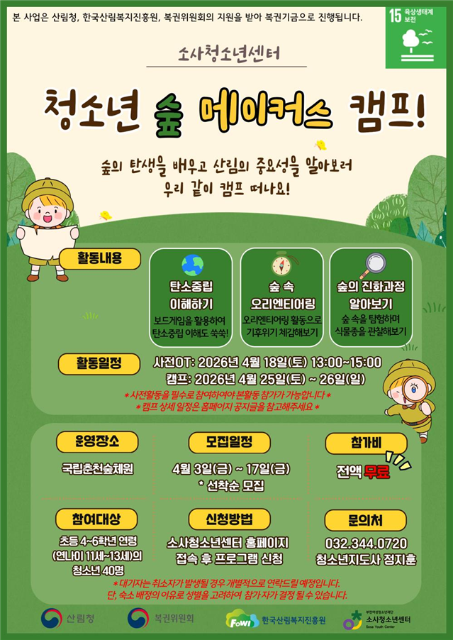 û¼Ò³â ½£ ¸ÞÀÌÄ¿½º Ä·ÇÁ´Â û¼Ò³âµéÀÌ ÁÖüÀûÀ¸·Î ½£ »ýŰ踦 ŽÇèÇÏ¸ç »ê¸²ÀÇ Á߿伺°ú ź¼ÒÁ߸³À» ÀÌÇØÇϴµ¥ ÃÊÁ¡À» ¸ÂÃè´Ù. ´õºÒ¾î Á÷Á¢ÀûÀÎ ½£ üÇèÀ» ÅëÇØ û¼Ò³âÀÇ Á¤¼­Àû ¾ÈÁ¤À» µ½°í ÀÏ»óÀÇ ½ºÆ®·¹½º¸¦ ÇØ¼ÒÇÒ ¼ö ÀÖµµ·Ï ±âȹµÆ´Ù.