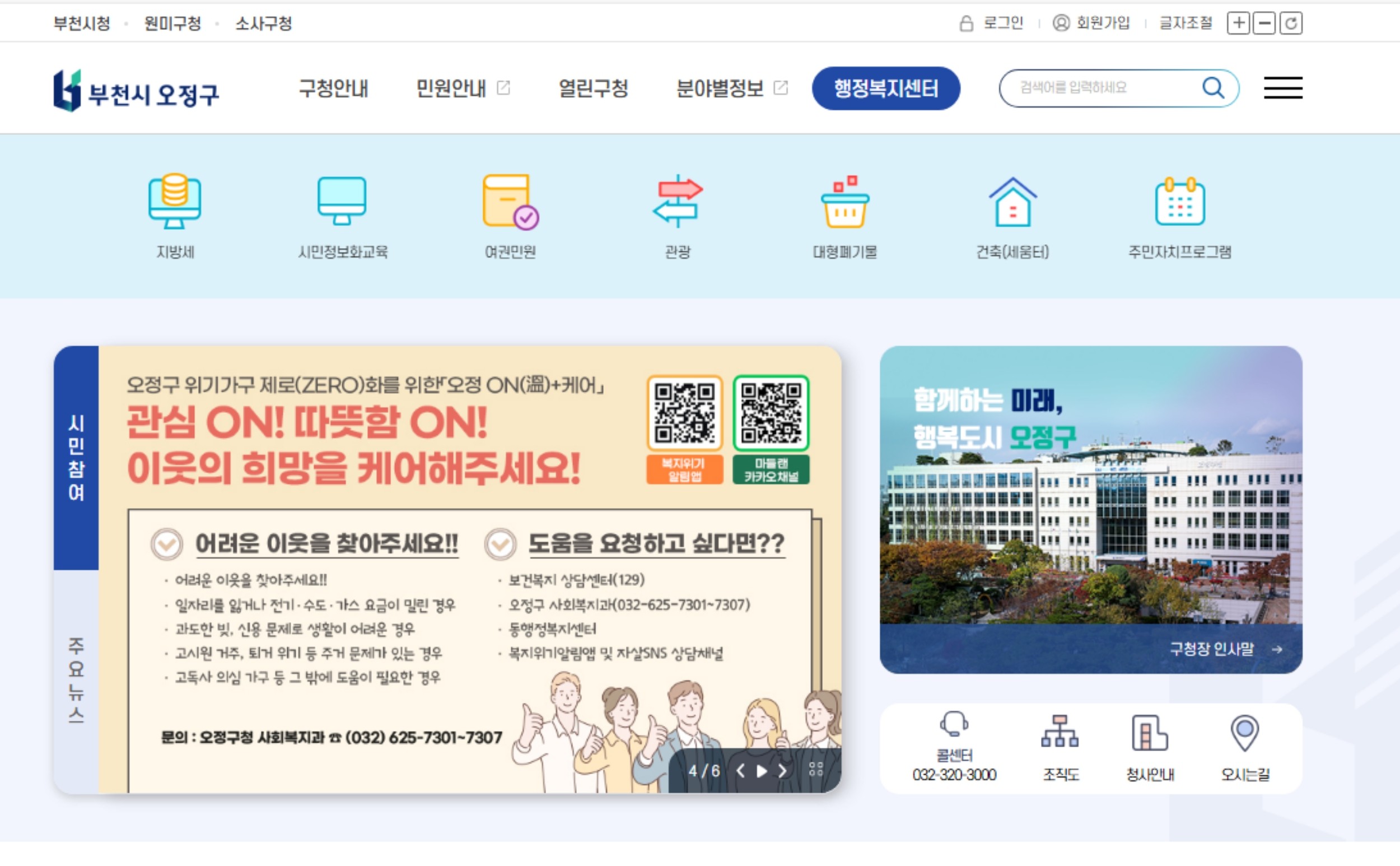ÇÑÆí, ¿ÀÁ¤±¸´Â º¹Áö»ç°¢Áö´ë ¹× ÀÚ»ì°íÀ§Ç豺 ¹ß±¼À» À§ÇØ Áö¿ªÀÇ ¡â¿ÀÁ¤º¸°Ç¼Ò ¡âºÎõ½ÃÀڻ쿹¹æ¼¾ÅÍ ¡âµ¿ ÇàÁ¤º¹Áö¼¾ÅÍ ¡â»çȸº¹Áö°ü µî°ú Çù·ÂÇÏ¿© ´Ù¾çÇÑ º¹Áö»ç¾÷À» ÃßÁøÇϰí ÀÖÀ¸¸ç, ÇϹݱ⿡µµ ȨÆäÀÌÁö È«º¸¿Í ¹Î°ü ÇÕµ¿ Ä·ÆäÀÎÀ» Áö¼ÓÀûÀ¸·Î ÃßÁøÇÒ °èȹÀÌ´Ù.