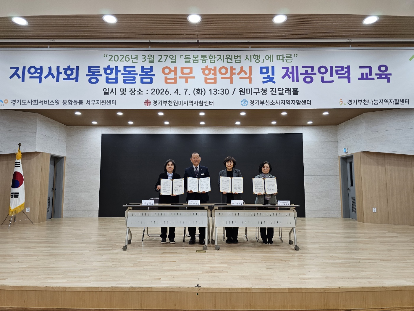 ¼¾ÅÍ´Â Áö³ 4¿ù 7ÀÏ ¿ÀÈÄ ºÎõ½Ã ¿ø¹Ì±¸Ã» Áø´Þ·¡È¦¿¡¼ °æ±âµµ»çȸ¼ºñ½º¿ø ÅëÇÕµ¹º½ ¼ºÎÁö¿ø¼¾Å͸¦ ºñ·ÔÇÑ ºÎõ³ª´®Áö¿ªÀÚȰ¼¾ÅÍ, ºÎõ¼Ò»çÁö¿ªÀÚȰ¼¾ÅÍ µî Áö¿ª À¯°ü ±â°üµé°ú ¡®Áö¿ª»çȸ ÅëÇÕµ¹º½ Çù·Âü°è ±¸ÃàÀ» À§ÇÑ ¾÷¹« Çù¾à¡¯À» ü°áÇß´Ù°í ¹àÇû´Ù.