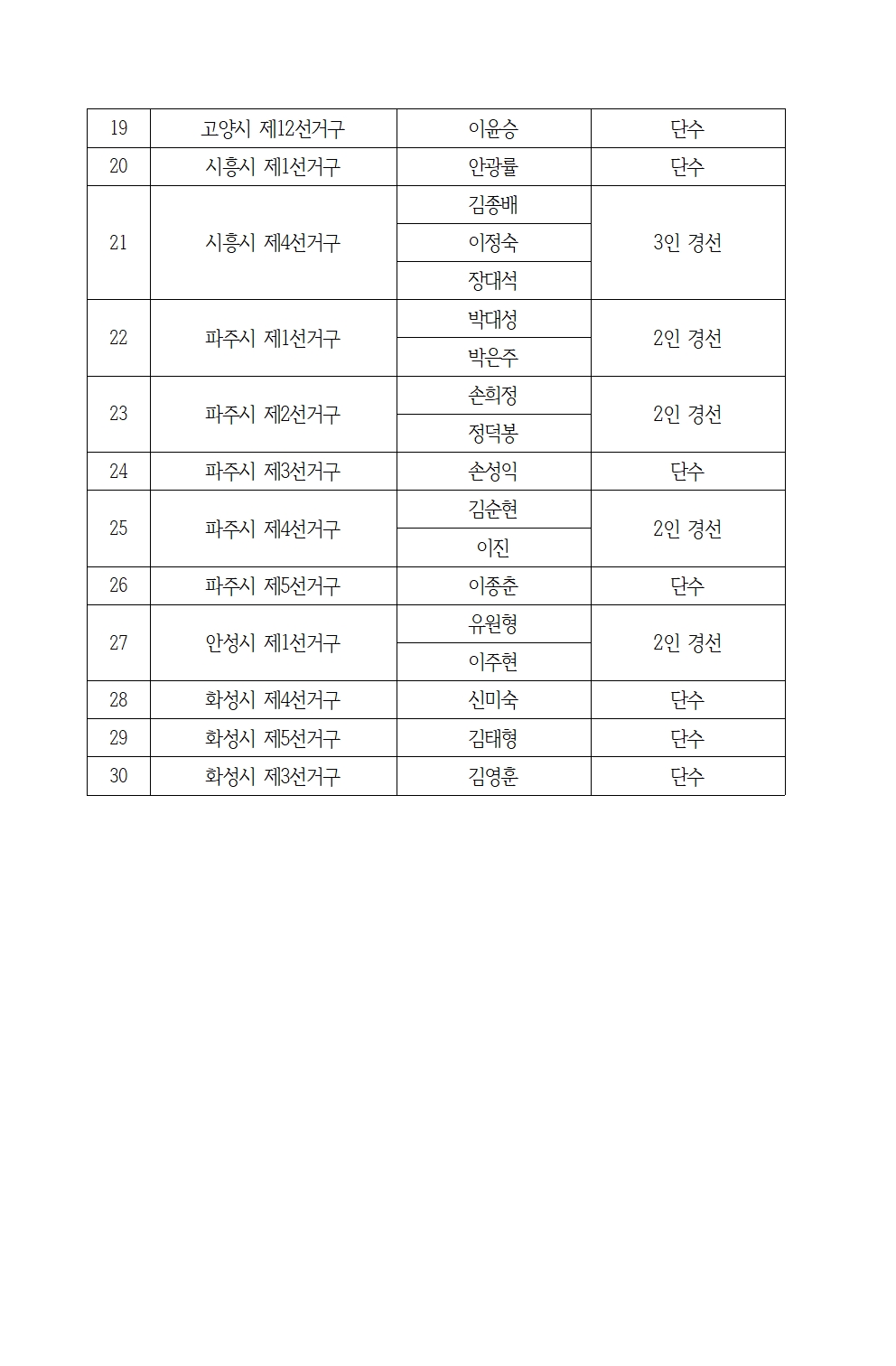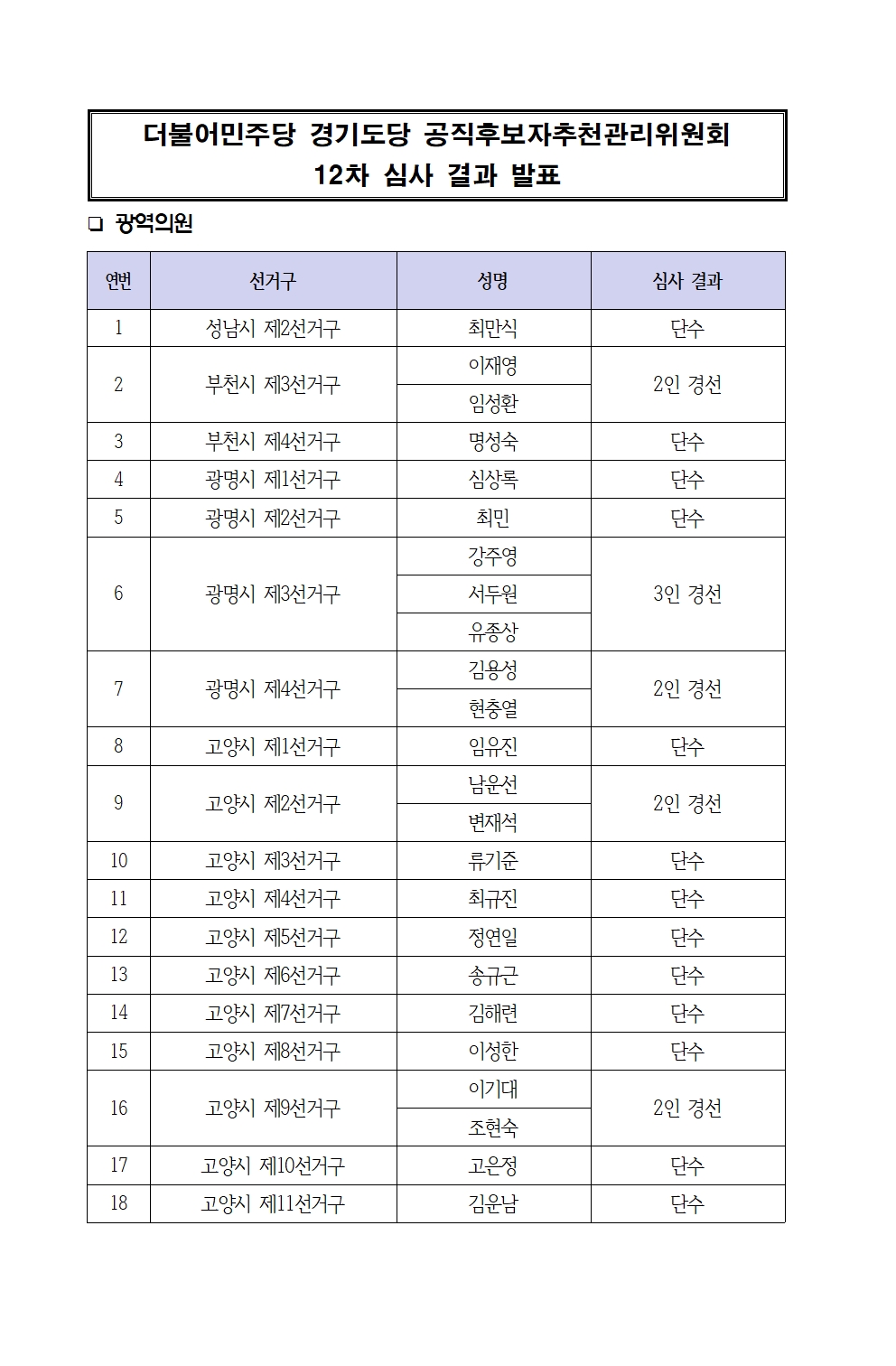 ´õºÒ¾î¹ÎÁÖ´ç °æ±âµµ´ç °øÁ÷Èĺ¸ÀÚÃßõ°ü¸®À§¿øÈ¸´Â 4¿ù 24ÀÏ ºÎõ µî °æ±âµµ ³» ÀϺΠÁö¿ª¿¡ ´ëÇØ Èĺ¸ÀÚÃßõ ½É»ç °á°ú¸¦ ¾Æ·¡ µµÇ¥¿Í °°ÀÌ ¹ßÇ¥Çß´Ù.