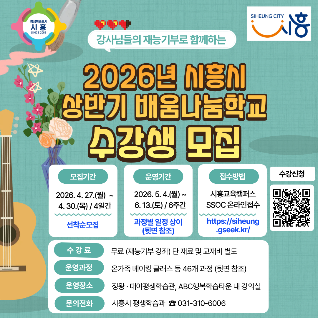 ½ÃÈï½Ã´Â ½Ã¹ÎÀÌ Á÷Á¢ °­»ç°¡ µÇ¾î Àç´ÉÀ» ³ª´©´Â ¿­¸° Æò»ýÇнÀ »ç¾÷ ¡®2026³â »ó¹Ý±â ½ÃÈï½Ã ¹è¿ò³ª´®Çб³¡¯¿¡ Âü¿©ÇÒ ¼ö°­»ýÀ» ¸ðÁýÇÑ´Ù.