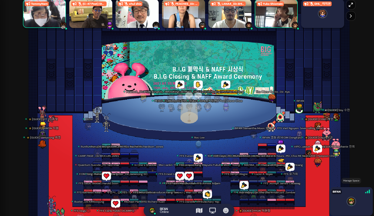 ¿ÃÇØ B.I.G´Â Äڷγª 19ÀÇ ¿µÇâÀ¸·Î ¿Â¶óÀο¡¼ ¿¾ú´Ù. ¡®°Ô´õŸ¿î¡¯(gather.town) ³» ¡®ºÎõ ÆÇŸ½ºÆ½ ij½½¡¯°ú ¡®ºñ´å½ºÄù¾î¡¯(b.square)¸¦ Áß½ÉÀ¸·Î ¡®È¯»ó¿µÈÇб³¡¯¿Í ¡®NAFF ÇÁ·ÎÁ§Æ® ¸¶ÄÏ¡¯ µîÀ» ¿î¿µÇß´Ù. Á¦ÀÛ È¯°æÀÌ ¾î·Á¿öÁø ¿µÈ°è »óȲ¿¡µµ ºÒ±¸ÇÏ°í ¡®NAFF ÇÁ·ÎÁ§Æ® ¸¶ÄÏ¡¯Àº »çÀü ¹ÌÆÃ ½Åû 1072°Ç, ÃÑ ¹ÌÆÃ 655°ÇÀ» ±â·ÏÇÏ´Â µî ¿ª´ë ÃÖ´Ù ¹ÌÆÃ °Ç¼ö¸¦ ±â·ÏÇß´Ù. Àü ¼¼°è ¿µÈÀεéÀÇ ¿Á¤À» È®ÀÎÇÒ ¼ö ÀÖ¾ú´Ù.