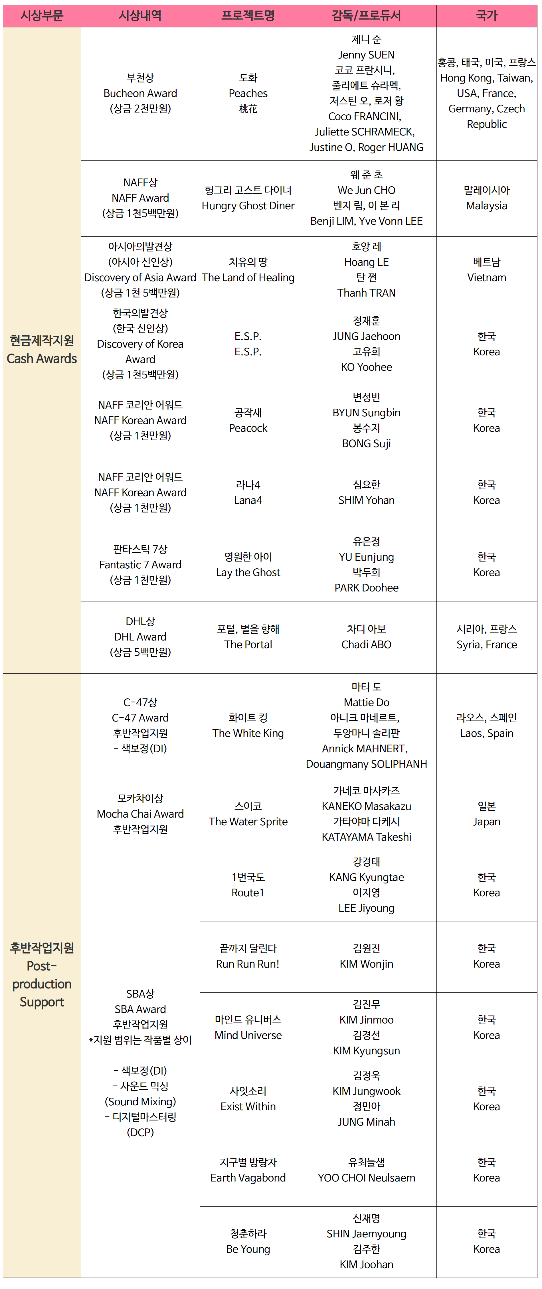 NAFF 2021 ½Ã»óÀº ¡â Çö±ÝÁ¦ÀÛºñ Áö¿ø ¡â ÈĹÝÀÛ¾÷ Çö¹°Áö¿øÀ¸·Î ³ª´¶´Ù. Çö±Ý 1¾ï¿ø, Çö¹° 2¾ï4500¸¸¿ø »ó´çÀ» Á¦°øÇÑ´Ù. ÃÑ 10°³ ºÎ¹® 16ÆíÀÇ ¼ö»óÀÛ Áß À̳¯¿¡´Â 8°³ ºÎ¹® 9ÆíÀÇ ¼ö»óÀÛÀ» ¹ßÇ¥Çß´Ù. (¡®ÆÇŸ½ºÆ½ 7»ó¡¯ ¼ö»óÀÛ 1Æí°ú ¡®¿öÅ© ÀÎ ÇÁ·Î±×·¹½º¡¯ ÈĹÝÀÛ¾÷ Áö¿øÀÛ 6ÆíÀº »çÀü ¹ßÇ¥ÇÔ) ºÎõ»ó(ÃÖ¿ì¼ö»ó)À» ºñ·ÔÇØ NAFF»ó(¿ì¼ö»ó), ¾Æ½Ã¾ÆÀÇ ¹ß°ß»ó(¾Æ½Ã¾Æ ½ÅÀλó), Çѱ¹ÀÇ ¹ß°ß»ó(Çѱ¹ ½ÅÀλó), NAFF ÄÚ¸®¾È ¾î¿öµå, DHL»ó µî Çö±ÝÁ¦ÀÛºñ Áö¿ø 6°³ ºÎ¹® 7Æí, ÈĹÝÀÛ¾÷Áö¿øÀº 2°³ ºÎ¹® 2ÆíÀÌ´Ù.