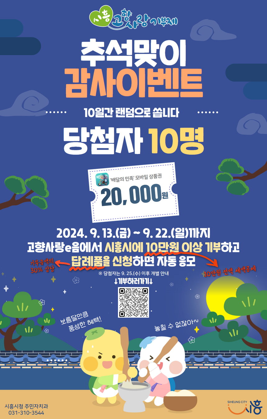 À̹ø À̺¥Æ®´Â Ãß¼® ¿¬ÈÞ ±â°£À» Æ÷ÇÔÇØ¼­ ÁøÇàµÇ¸ç °íÇâ»ç¶ûÀÌ(e)À½ ´©¸®Áý(https://ilovegohyang.go.kr)À» ÅëÇØ ½ÃÈï½Ã¿¡ 10¸¸ ¿ø ÀÌ»ó ±âºÎÇÏ°í ´ä·ÊǰÀ» ÁÖ¹® ¿Ï·áÇϸé ÀÚµ¿À¸·Î ÀÀ¸ðµÈ´Ù.